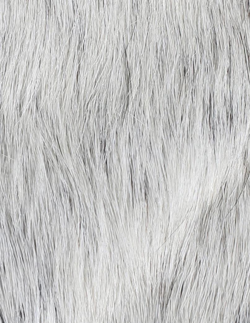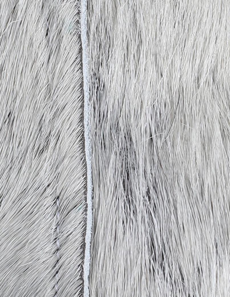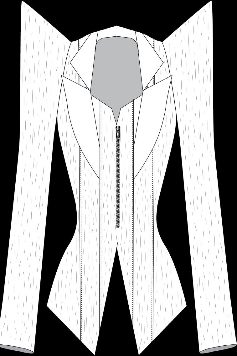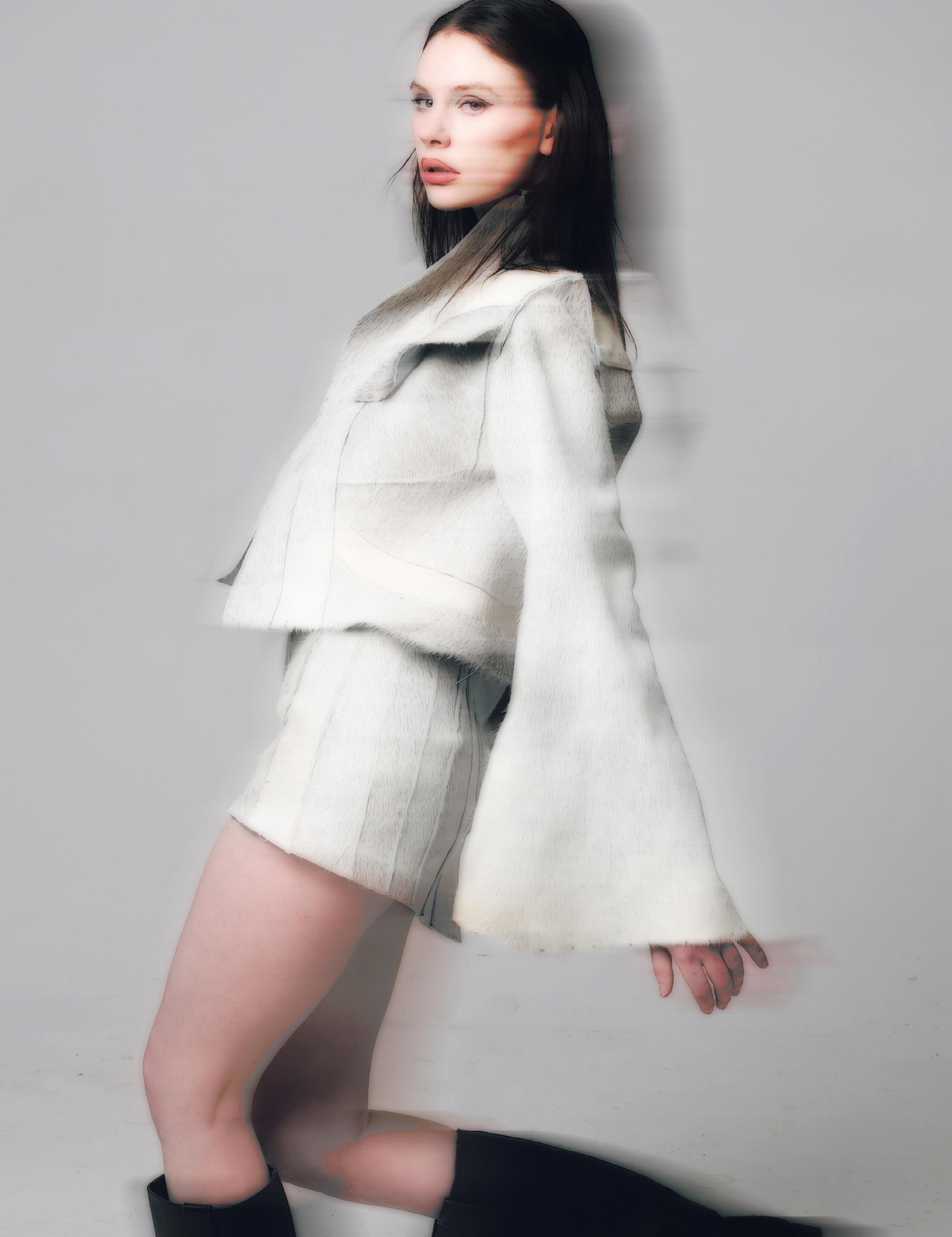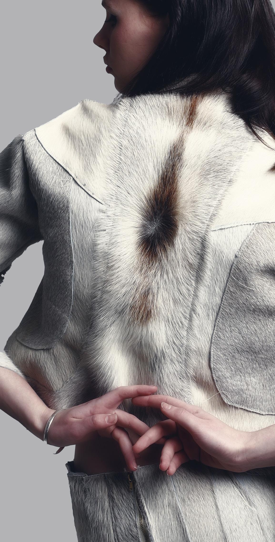 Working with cowhide in its natural hair-on state, the gar ments preserve the animal’s physical remnant. Precise cutting exposes the hide’s anatomy, and choices like aligning its spine with the wearer’s own create an unsettling dialogue between two forms, as if one body has been grafted onto another.