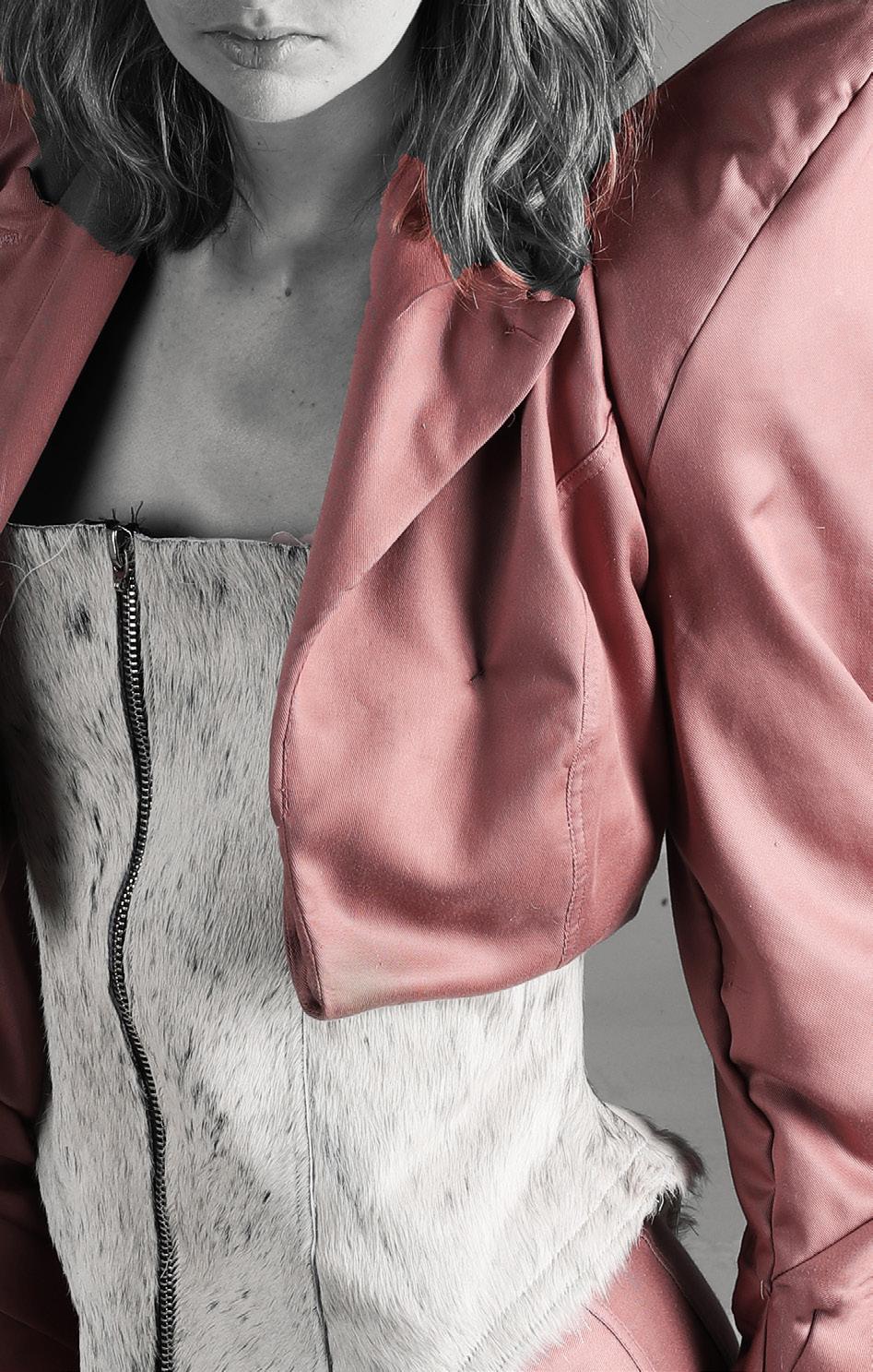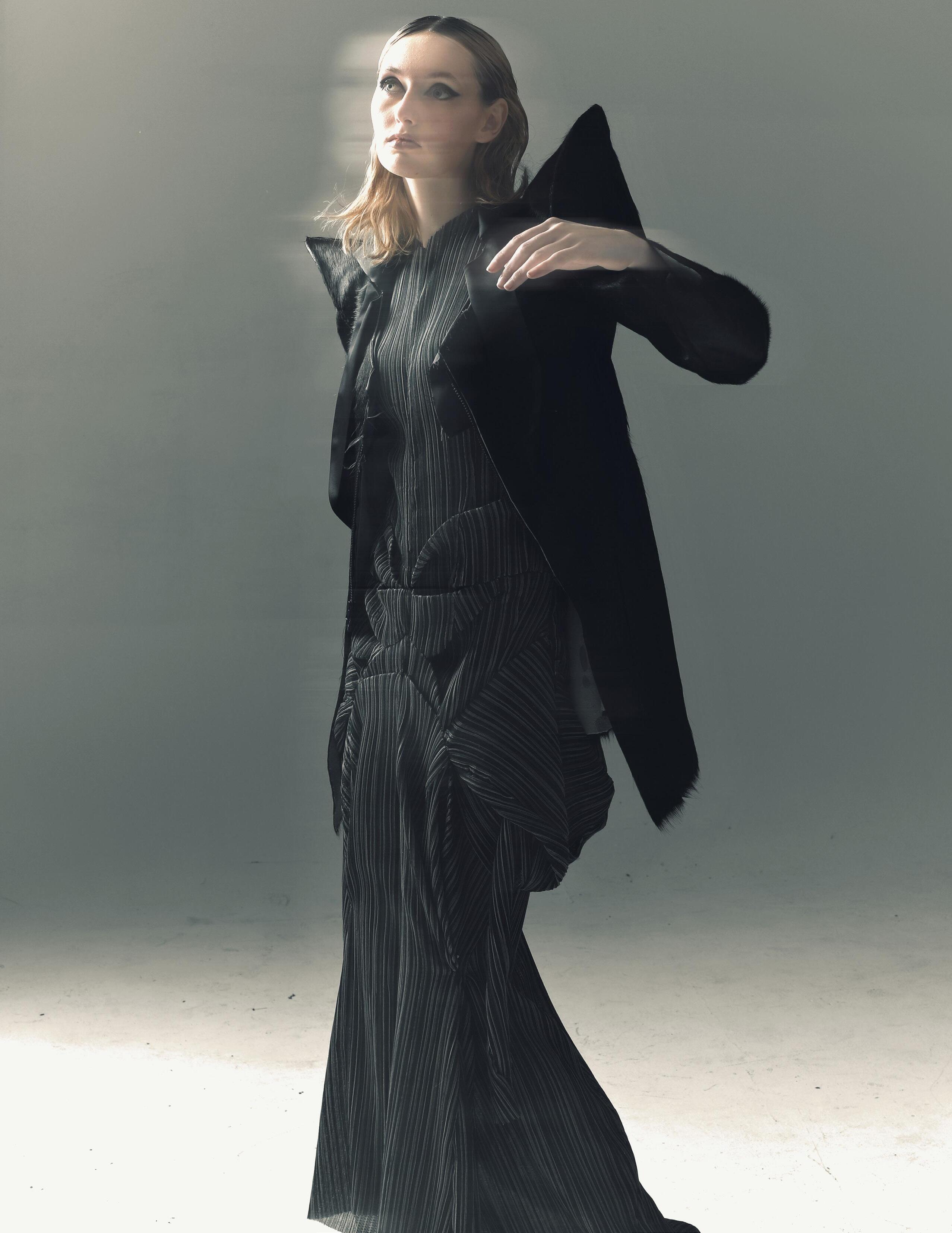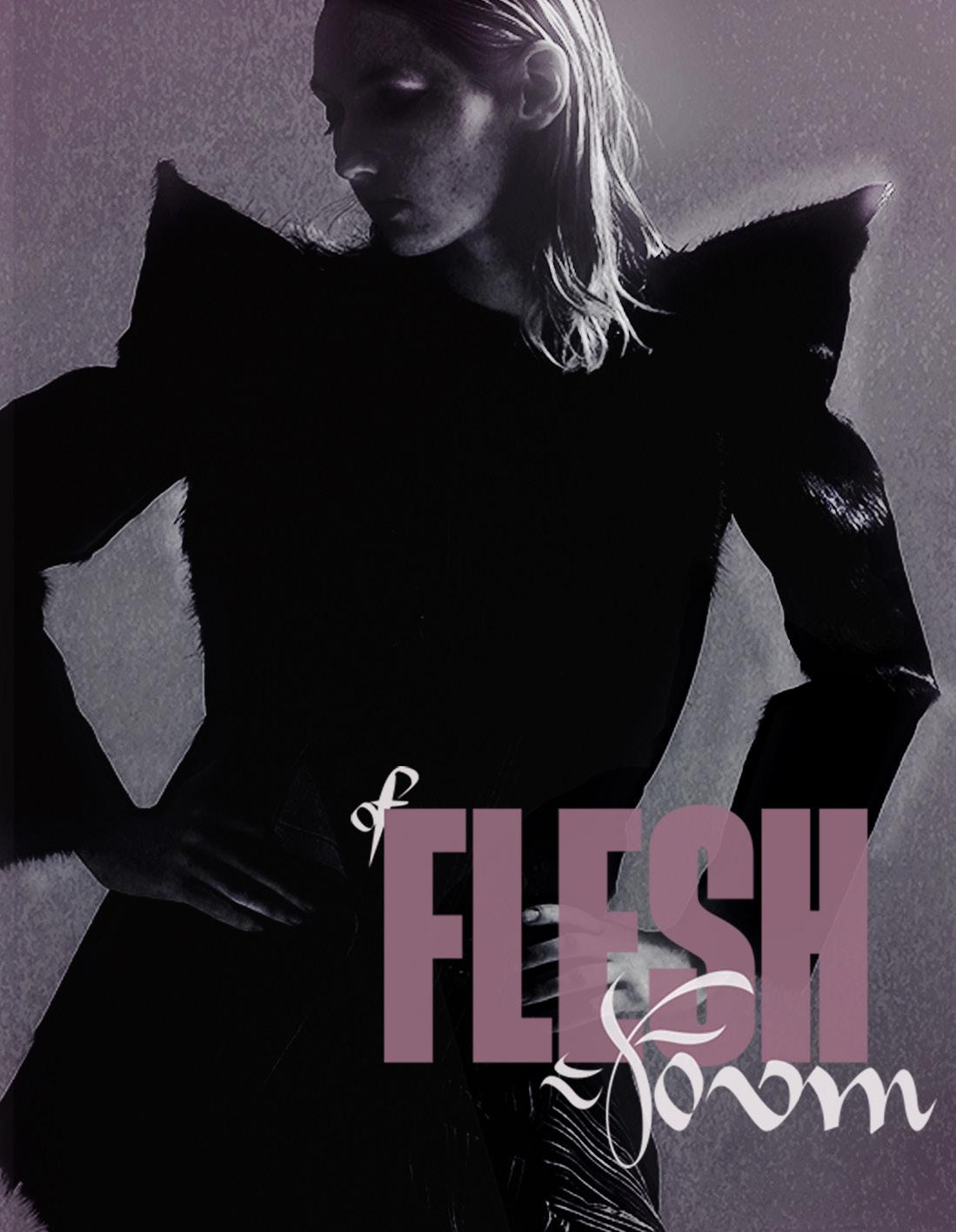 Of Flesh and Form delves into the entanglement of the human body, material, and transformation. The collection confronts fashion’s history of carving power, beauty, and status out of the natural world, questioning how the human figure is elevat ed through the literal and symbolic use of other bodies.