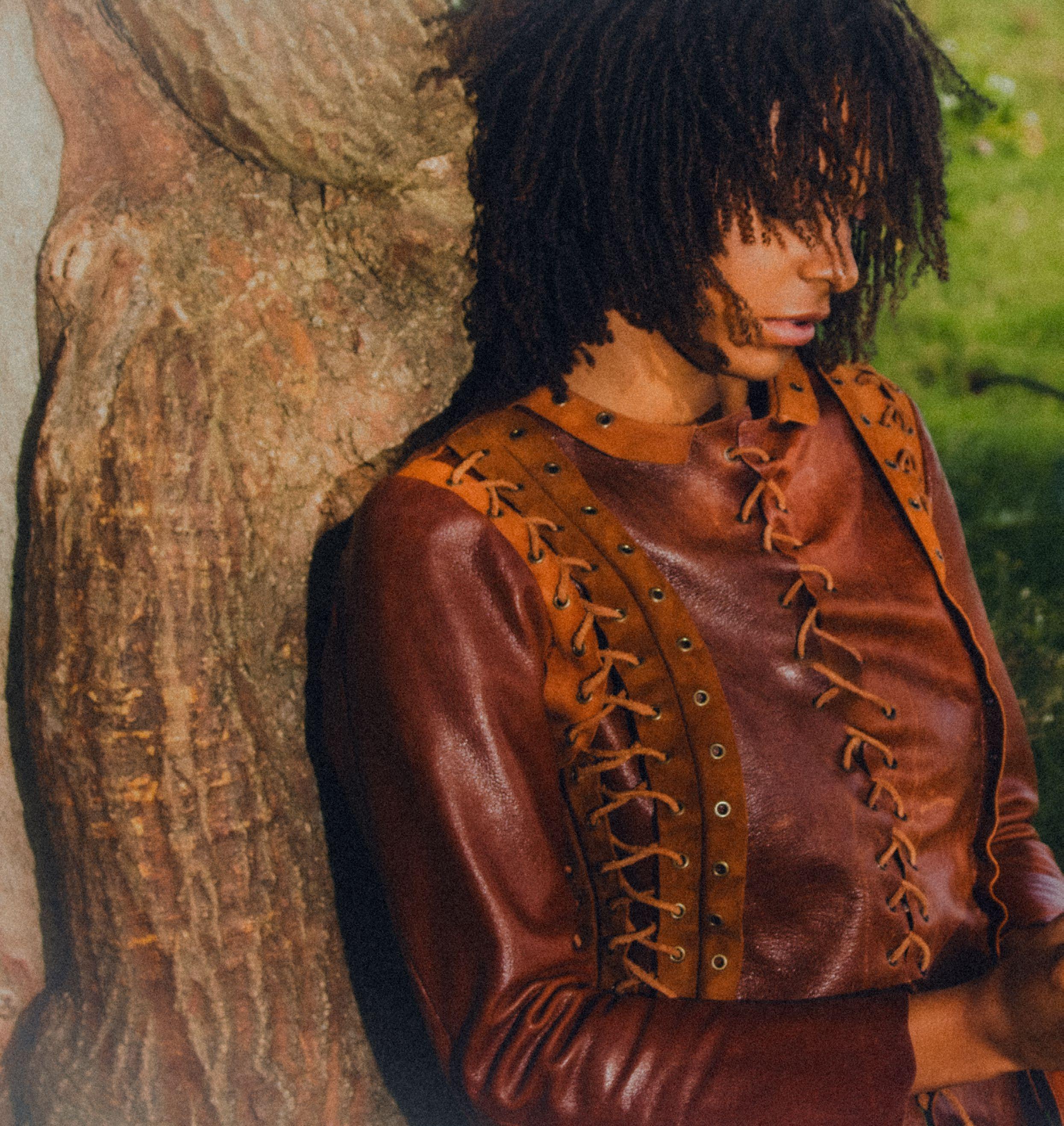 Shaziah wears leather lace up jacket by ABBEY HOY