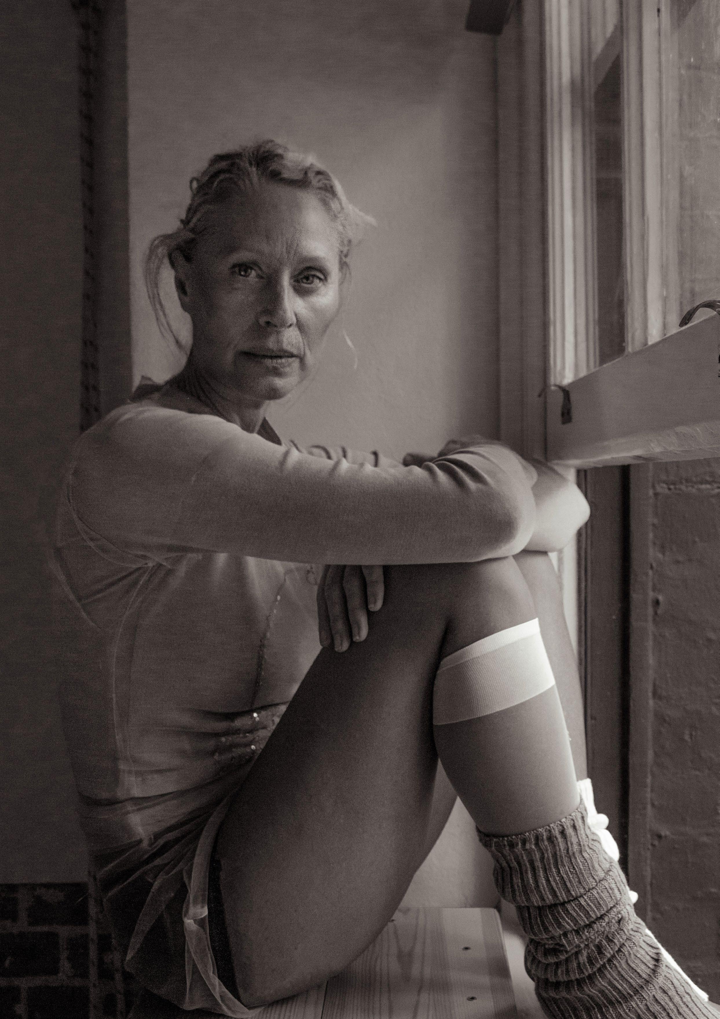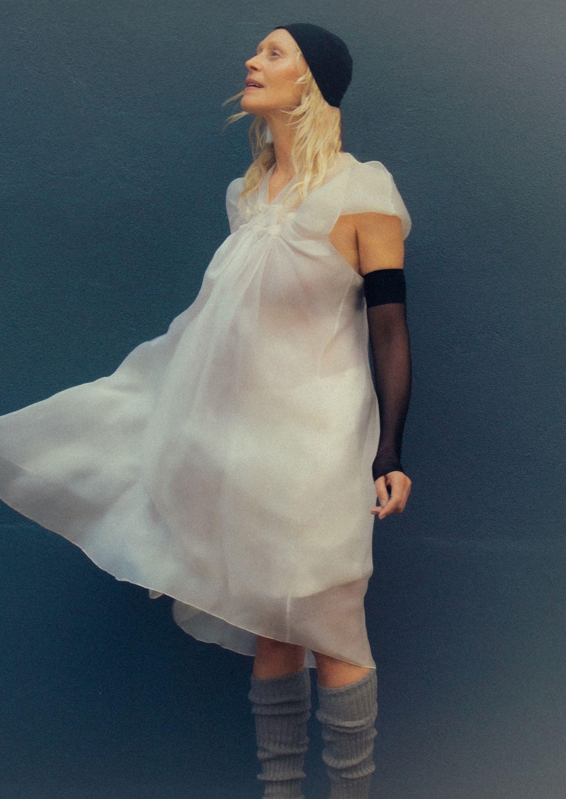 Opposite: Tara wears wool coat by and silk skirt by AUBREY ROSE DIOR