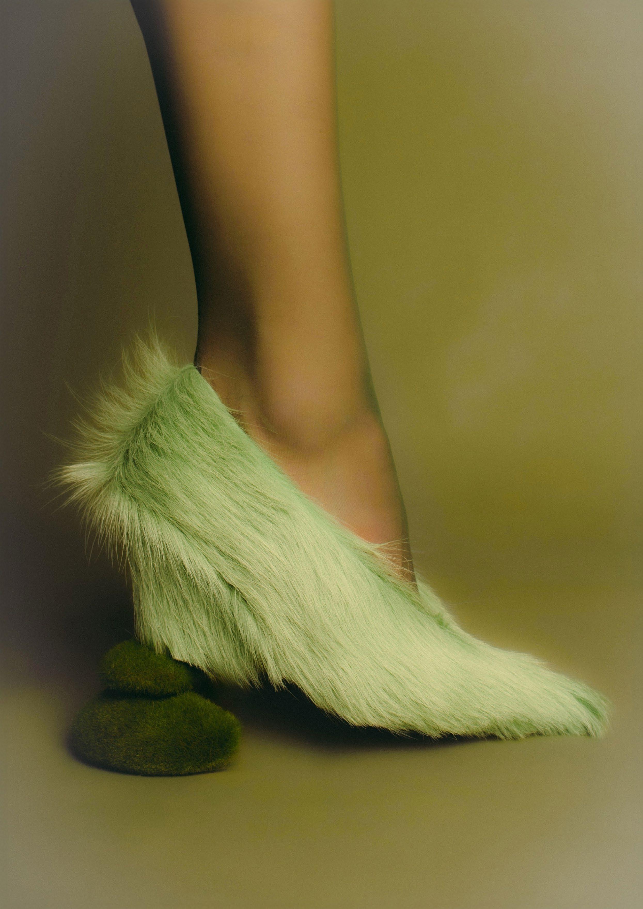 Stylist’s own bangle and shoe, handmade wood stool