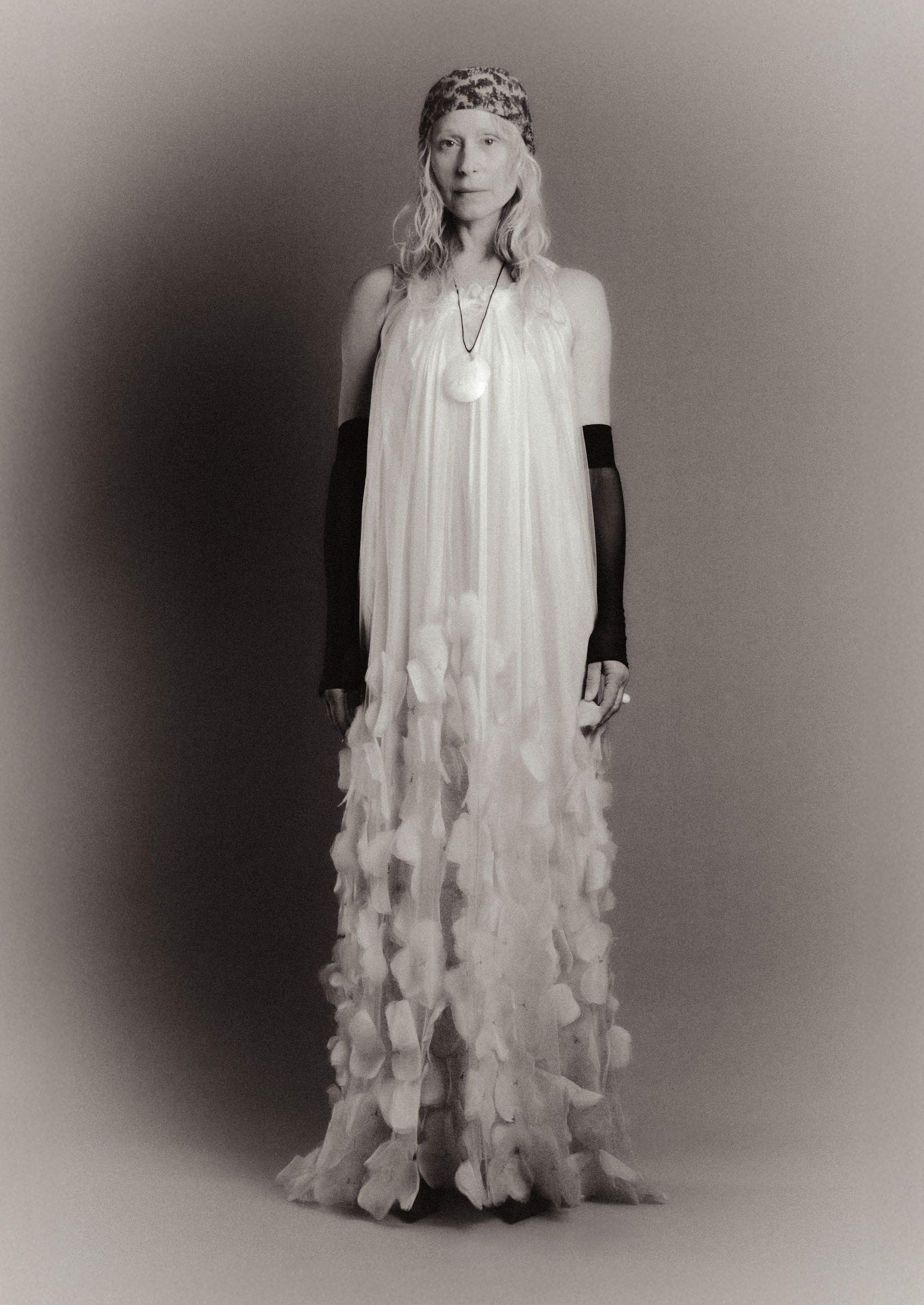 Tara wears floral silk midi dress by and stylist’s own hoisery and headpiece AKIRA ISOGAWA