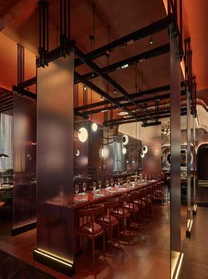 Due to the way an interior designer approaches the project’s idea and brief, materiality is crucial. This Japanese restaurant was designed by Rockwell Group in a way that effectively demonstrated materiality reflecting the idea while embracing the components and design concepts. In the main dining area, a pair of arched openings with many clear glass screens discreetly printed with wagasa (Oil-paper umbrellas) pictures split the room into three sections. Red lacquer and square hardwood tiles that have been inlaid decorate the archways, which are fashioned to resemble torii and pagoda architecture. Although the arch in question is a particular kind of architecture, it really symbolises the line dividing the shrine’s hallowed sanctuary from the rest of the world. The screens are suspended on a black powder-coated aluminium frame with joinery that resembles that of Kumiko wood.
