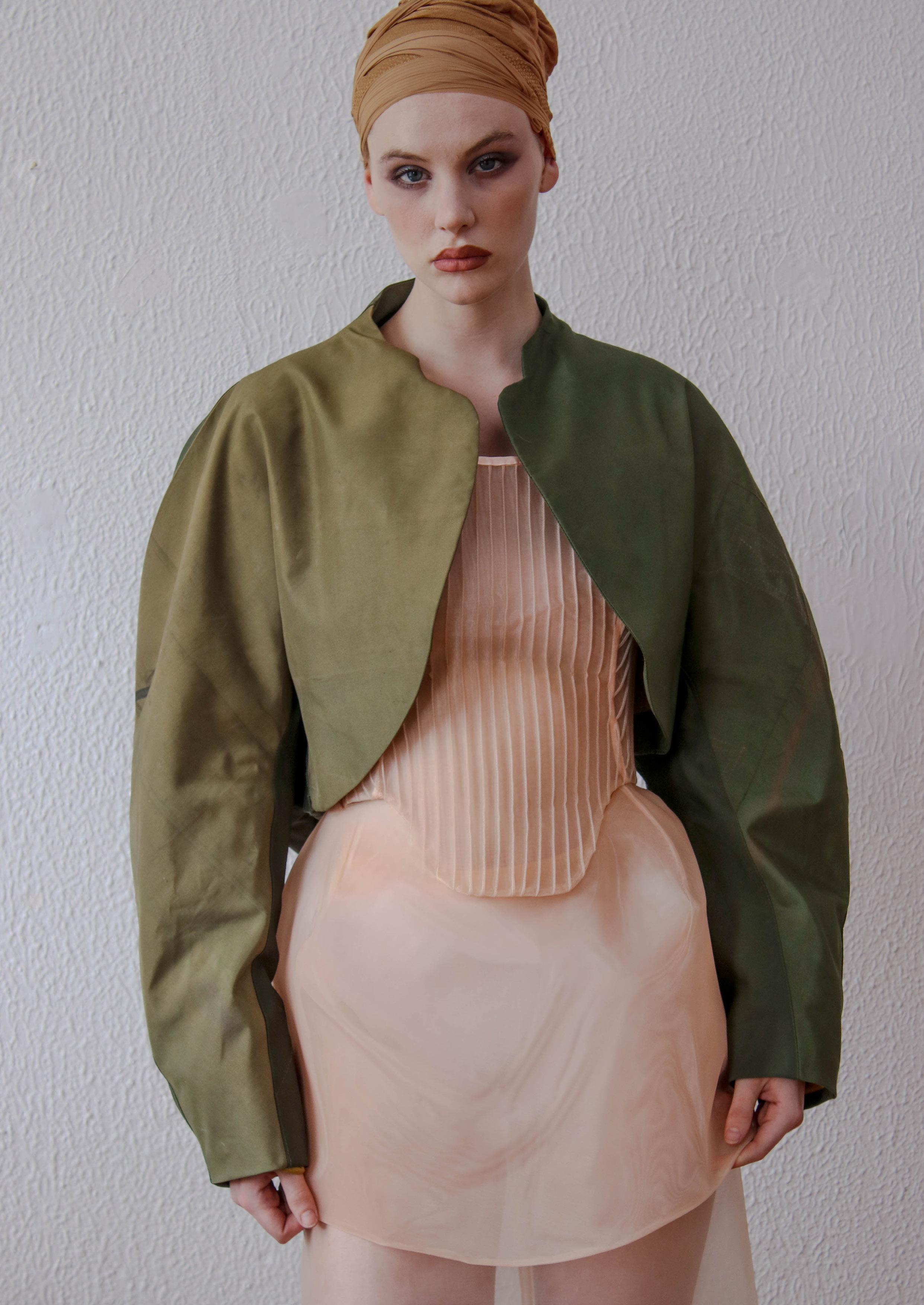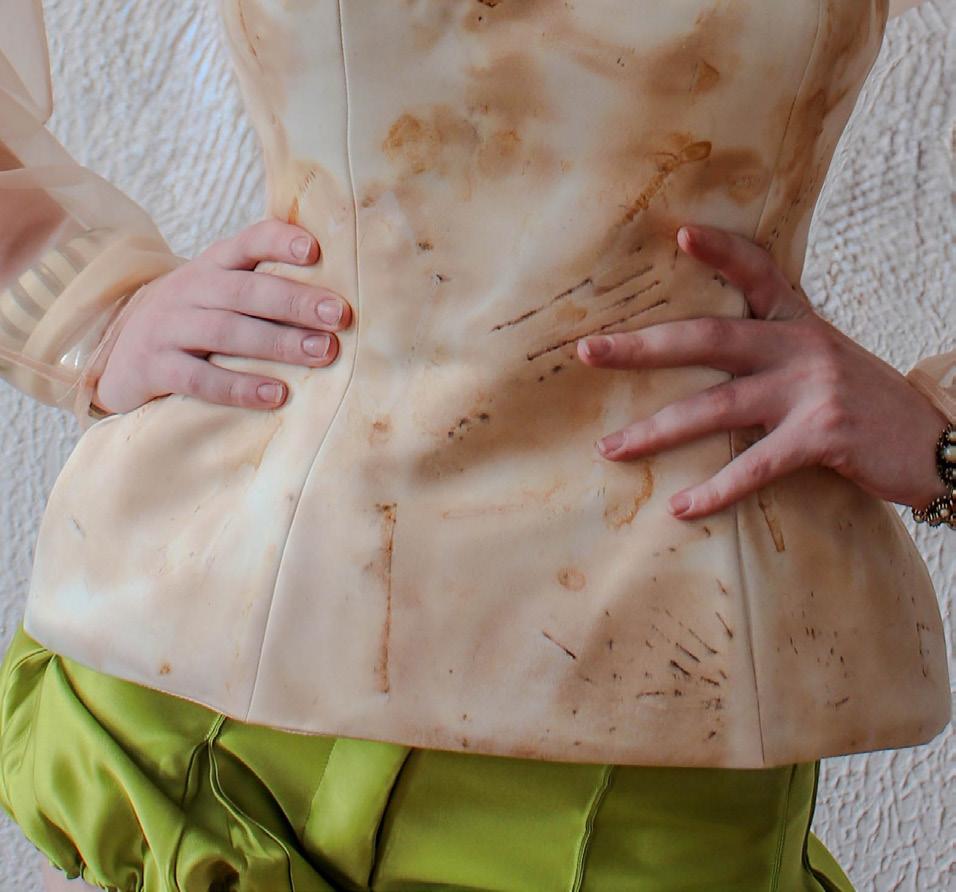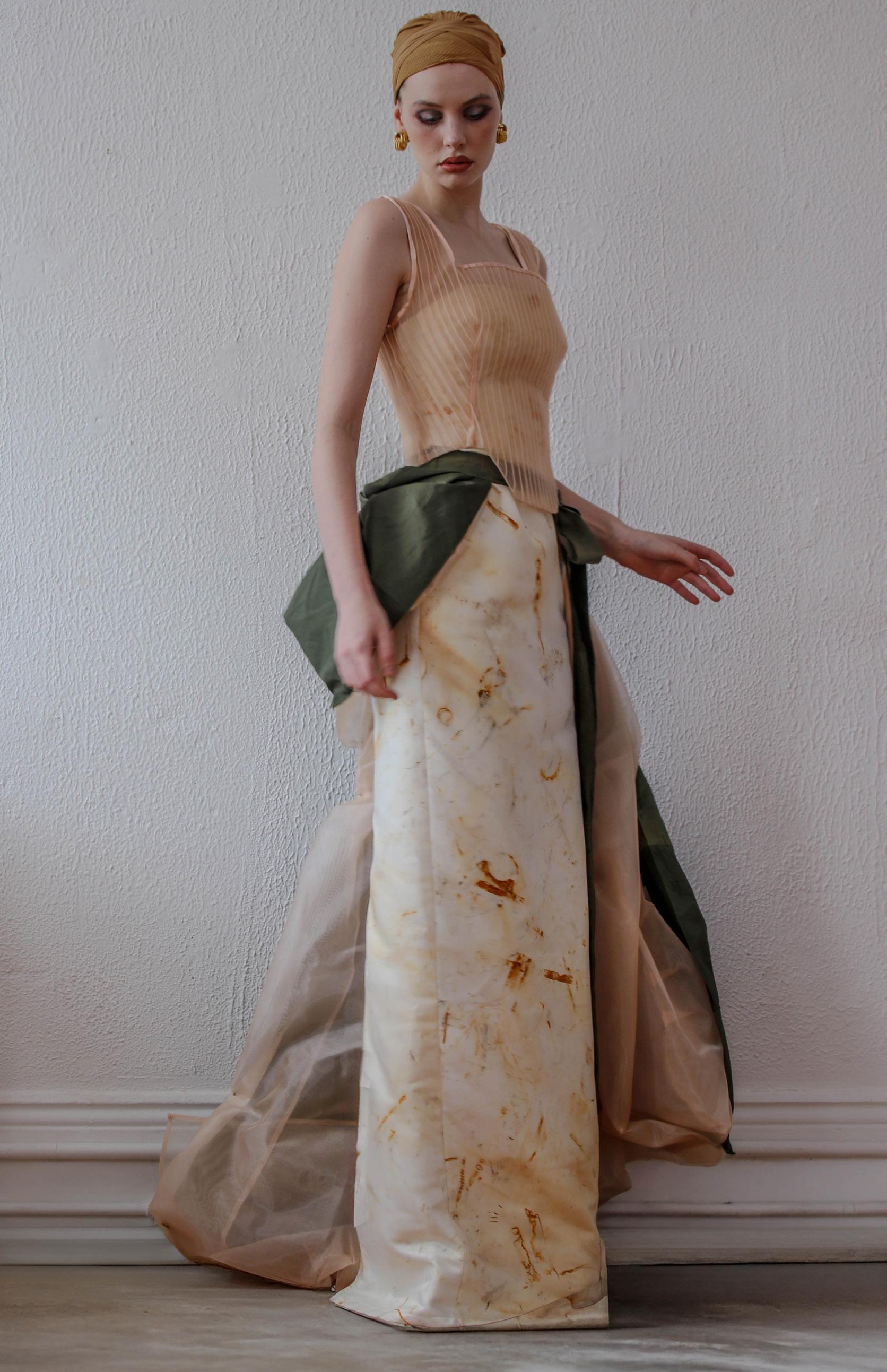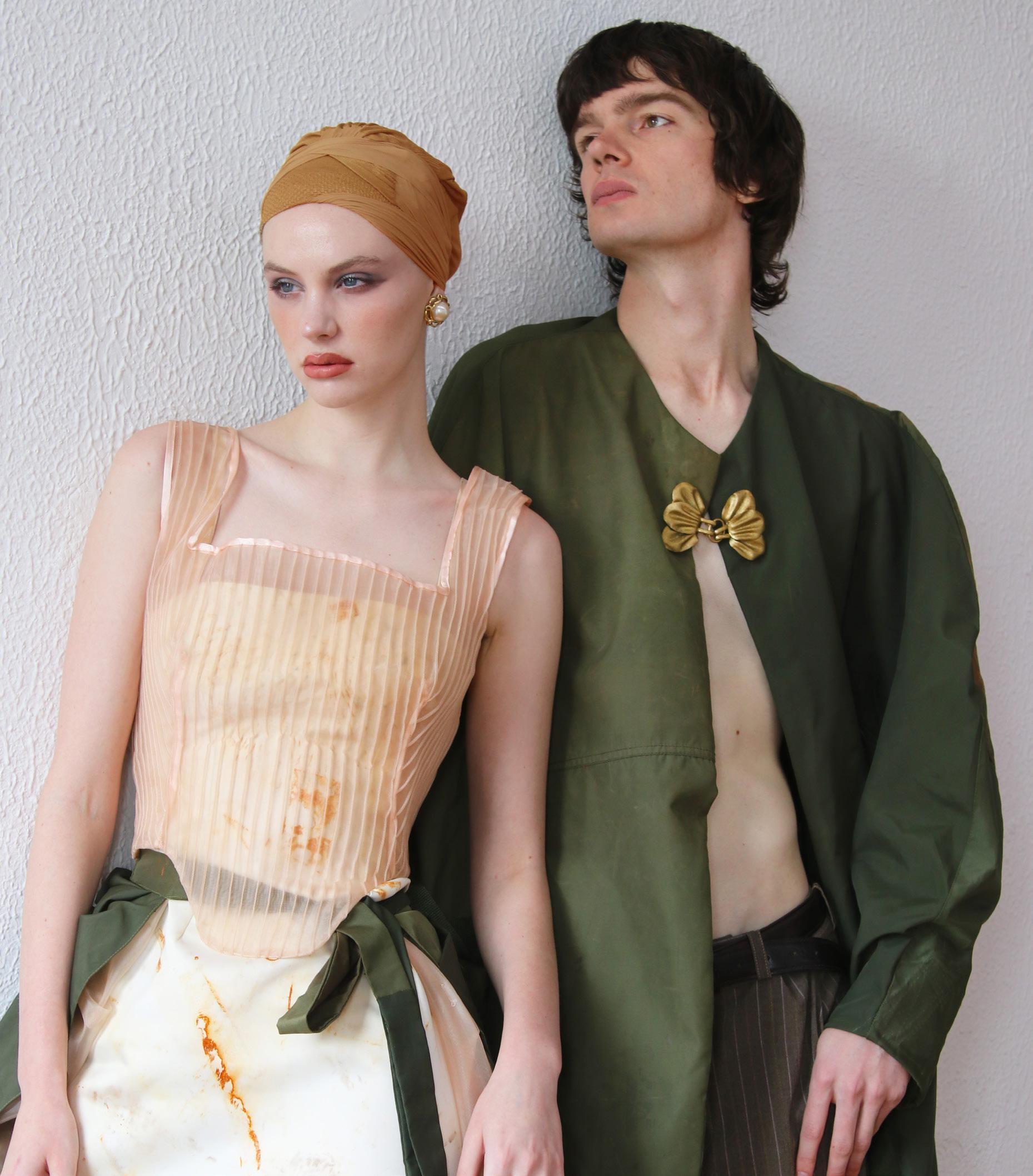 Affections explores the emotions from love to despair, capturing the power dynamics and raw vulnerability that we wear on our sleeves. It reflects on how intimacy can both protect and expose us, revealing the emotional weight of connection and often a reflection on how we present ourselves. Drawing inspiration from the 16th-century Renaissance, the collection features structured corsetry, voluminous sleeves, and romantic drapery. Each piece embodies historical aesthetics reinterpreted through a contemporary lens. Recycled materials are reimagined into fabrics, hand-dyed with rusted metals to create organic, textured designs. The result is a story of old into new, a balance between beauty and decay, strength and fragility.