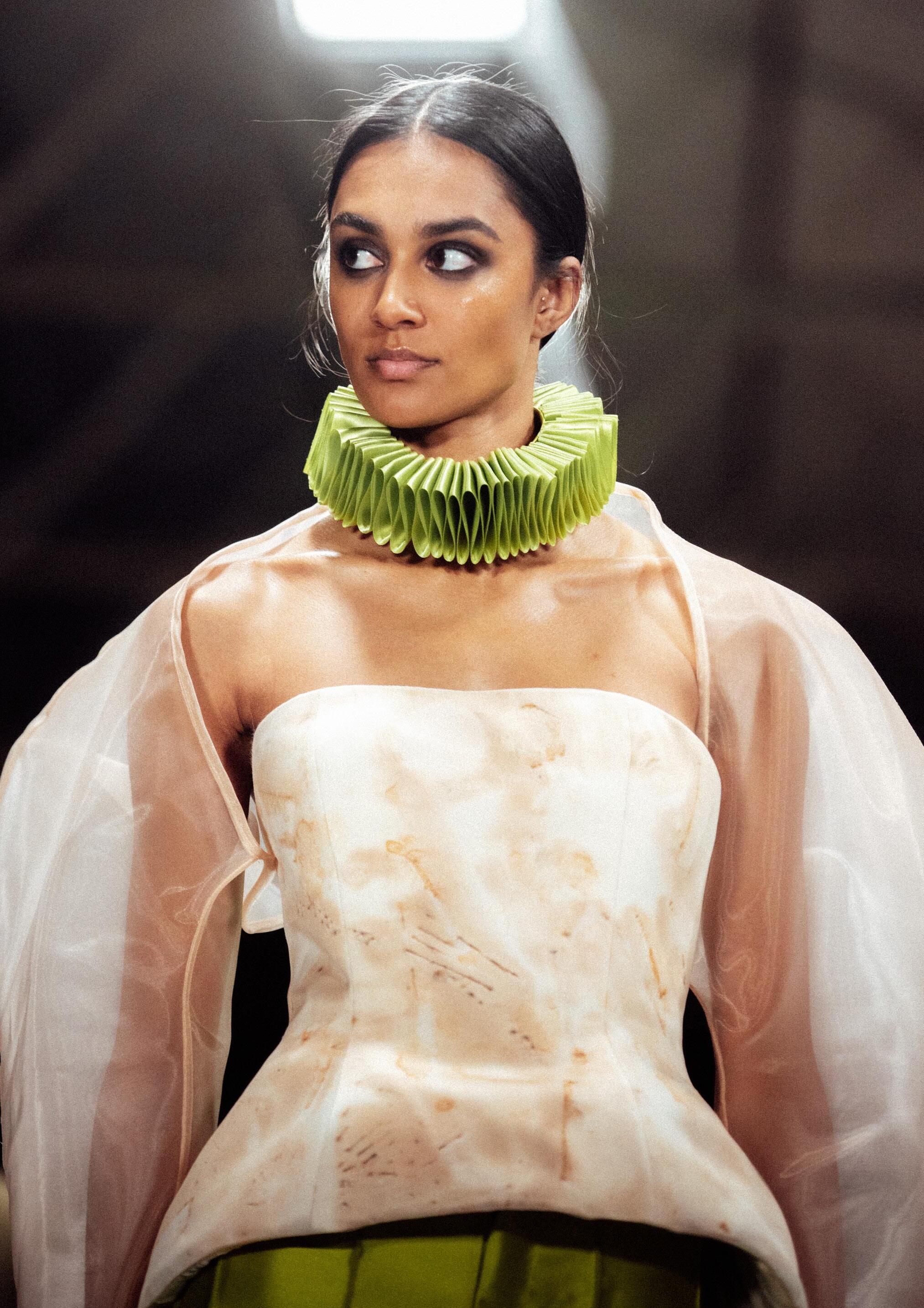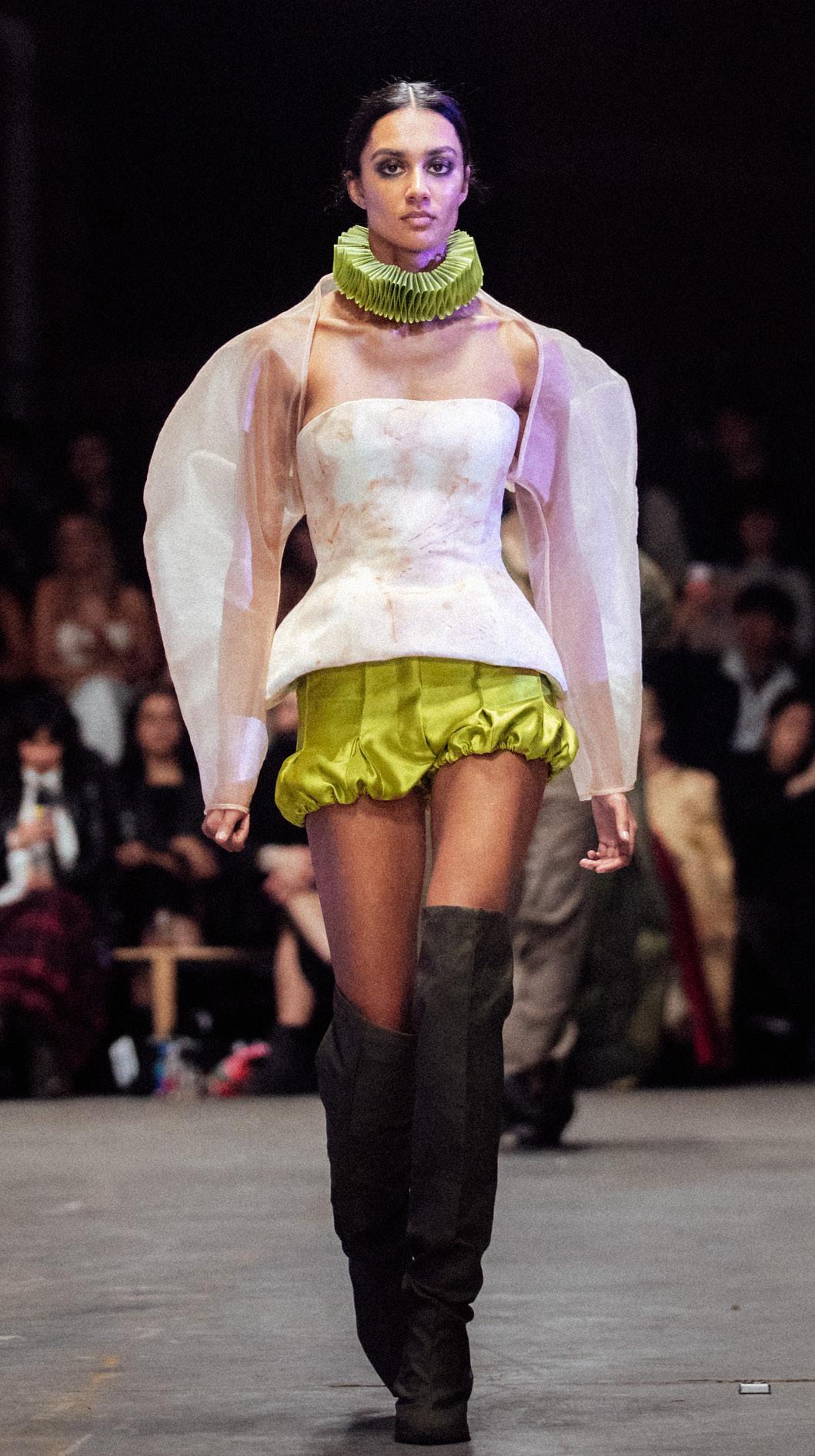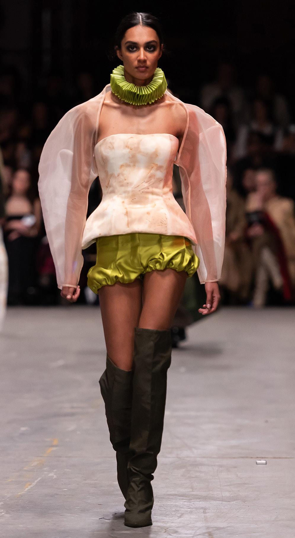 Affections explores the emotions from love to despair, capturing the power dynamics and raw vulnerability that we wear on our sleeves. It reflects on how intimacy can both protect and expose us, revealing the emotional weight of connection and often a reflection on how we present ourselves. Drawing inspiration from the 16th-century Renaissance, the collection features structured corsetry, voluminous sleeves, and romantic drapery. Each piece embodies historical aesthetics reinterpreted through a contemporary lens. Recycled materials are reimagined into fabrics, hand-dyed with rusted metals to create organic, textured designs. The result is a story of old into new, a balance between beauty and decay, strength and fragility.