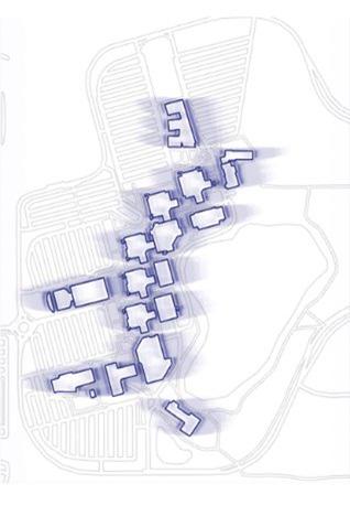 Valencia State College – West Campus' collection of buildings create a casbah situated between large parking areas and a picturesque lake.