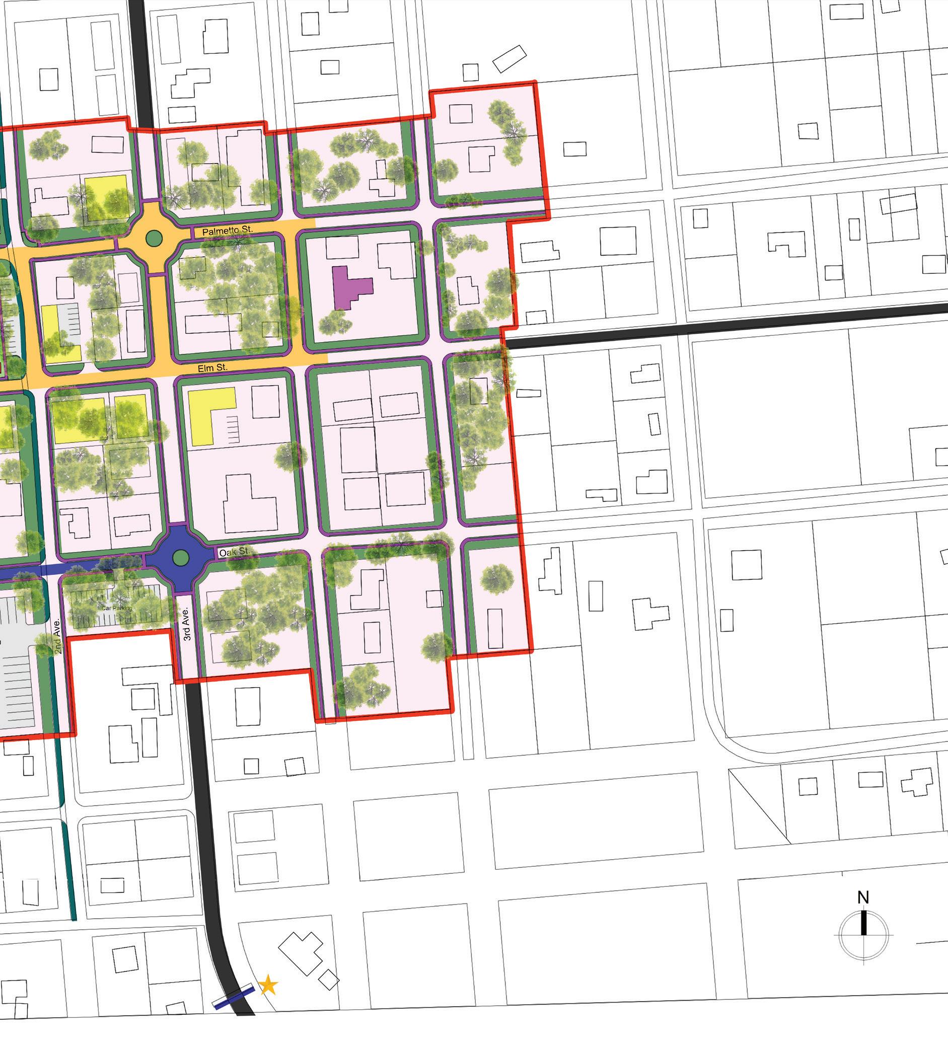 3. Define the streets hierarchy and propose conditioning them for rain management and modality split, dedicating 2nd street to light transportation, and sharing uses in the surrounding streets. Further studies are recommended for the proposals on CR 309.