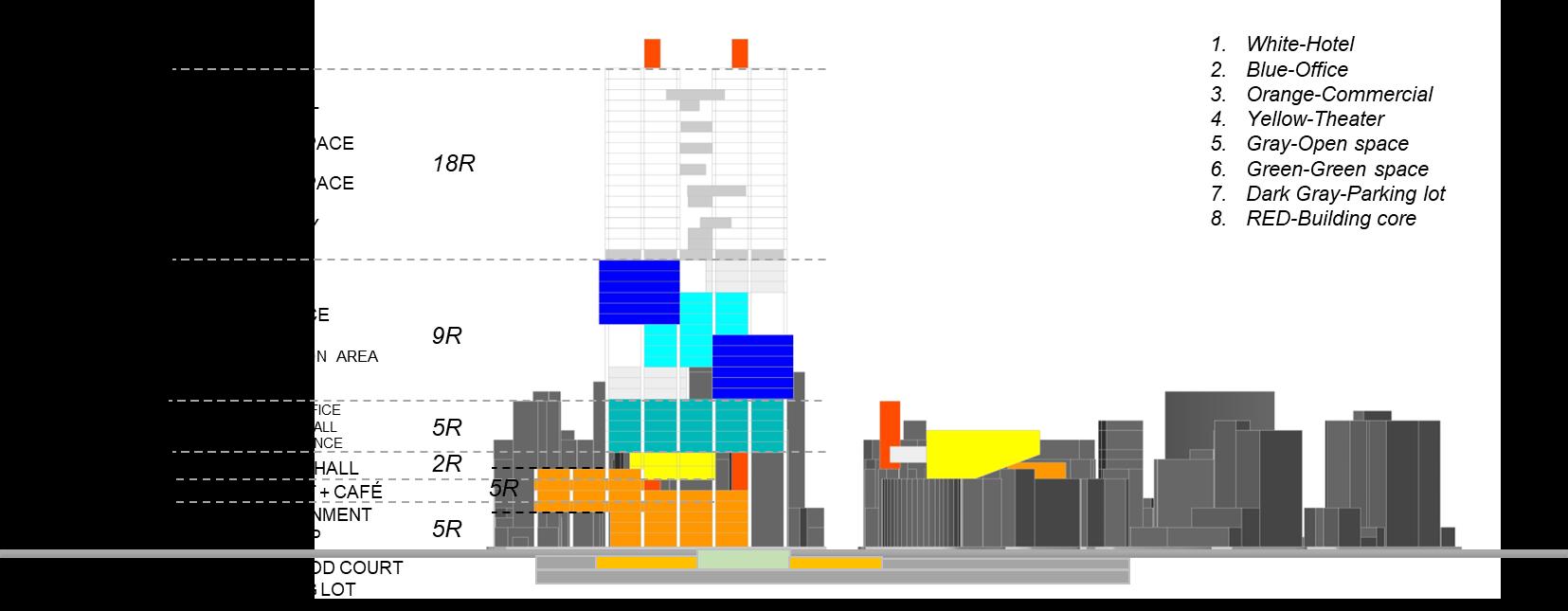 1. 停車場 2. 高架橋連接 3. 住宅/旅館 4. 市場(西寧市場 & 五金電子商場) 5. 百貨公司/賣場 6. 餐廳/美食街 7. 商業辦公室 8. 公共/綠地空間 Parking