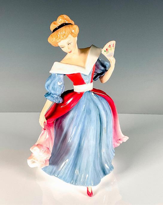 Gracefully seated on a pedestal, a young blonde woman captivates in her vibrant purple, yellow, and pink dress, holding a large matching fan behind her with elegance. Royal Doulton backstamp.