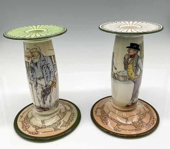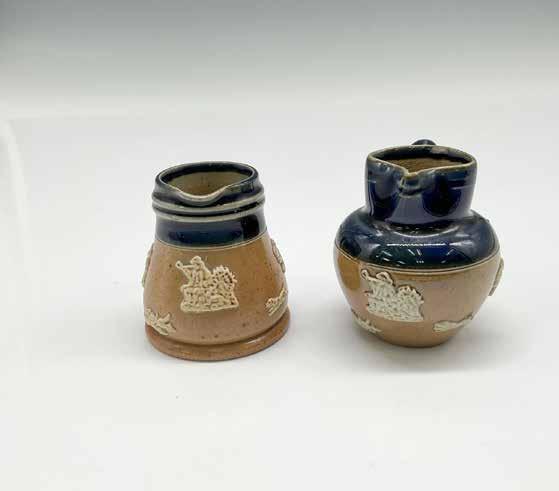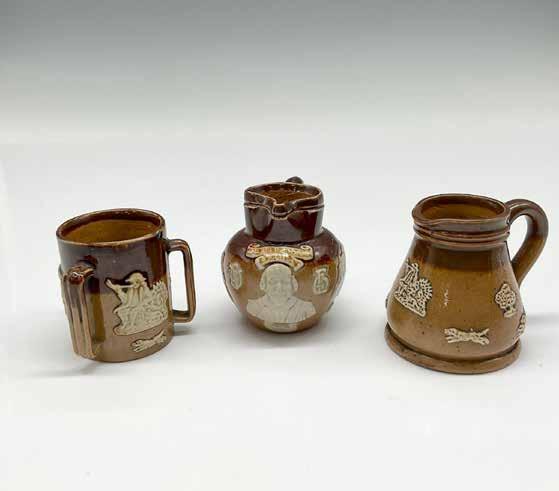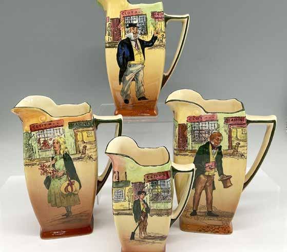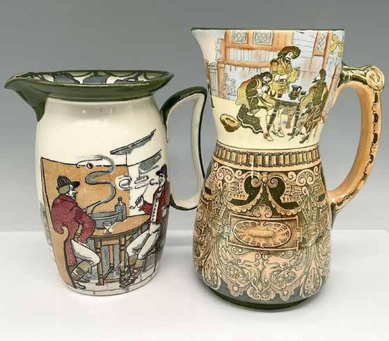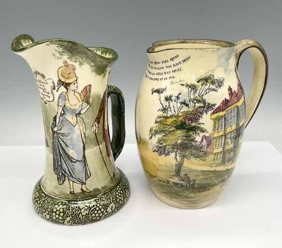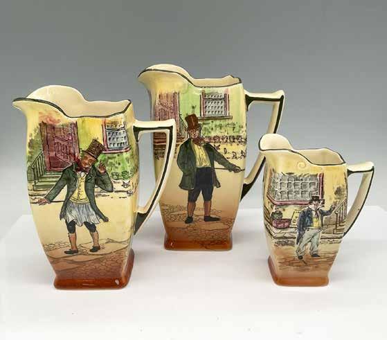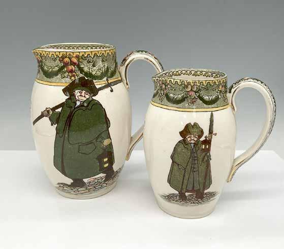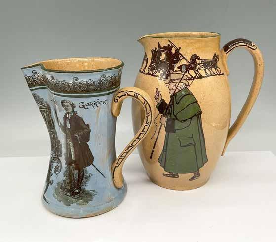 Stoneware pitchers with The Coachman with stagecoach design above and David Gorrick in blue background designed with his first performance at St. John’s Gate. Royal Doulton backstamp.
