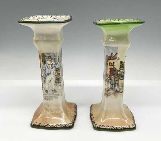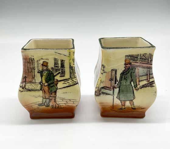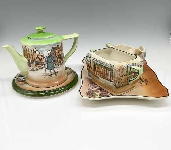 Porcelains designed with wedding scene with banner Wedlock is a ticklish thing, ho merrily ho and The Queen’s Head Inn 17th century. Royal Doulton backstamp.
