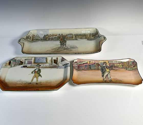 Lot includes 2 rectangular plates, 1 nut dish and 1 coin dish. All hand painted with scenes of Stratford Church, The Tower of London and The Star Inn. Royal Doulton backstamp.