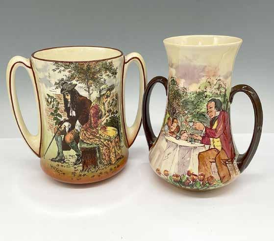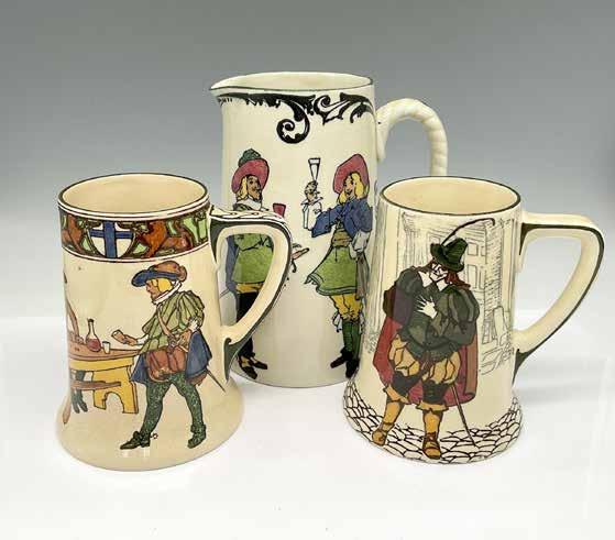 Ceramic mugs with a scene of Sir Andrew Aguecheek D4750 and The New Cavaliers (2 sizes) D4719 designed in bright coloration with glossy finish. Royal Doulton backstamp.