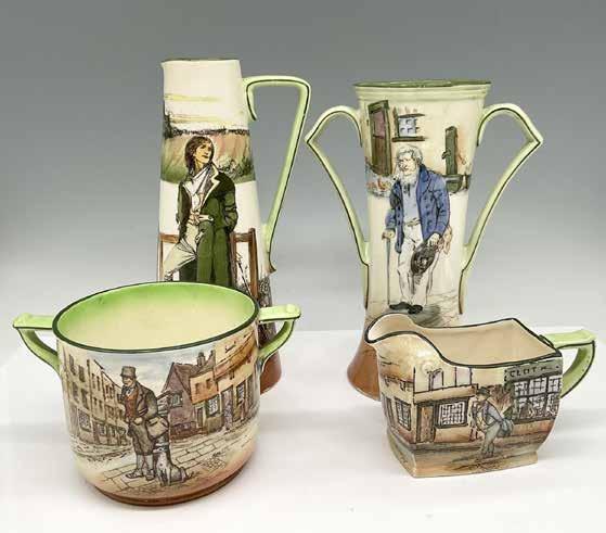 Lot includes a plate, 3 pitchers and a vase all designed with Sairey Gamp. Colored in shades of green, orange and brown. Royal Doulton Dickens Ware backstamp.