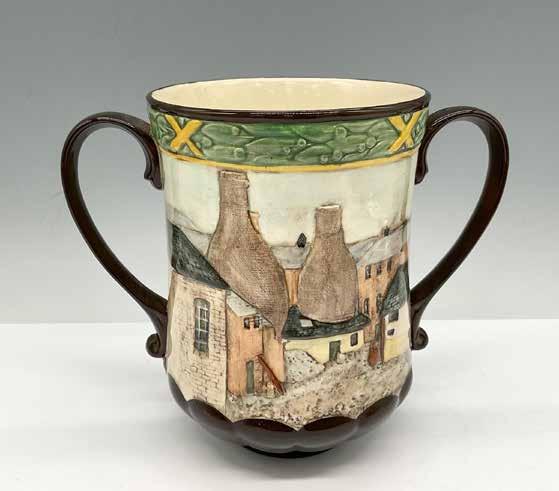 This cup was made exclusively for Collectors Club members. Double handled cup with raised design of women working in their pottery studio on one side and a village scene on the other. Royal Doulton backstamp.