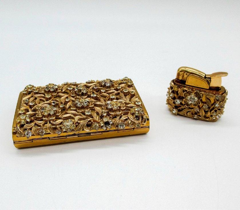 Beautiful gilded gold tobacciana set with diamondrhinestones petals. Evans Fuel impressed on the lighter base. Lighter: 1in x 1.75in x 2.5in.