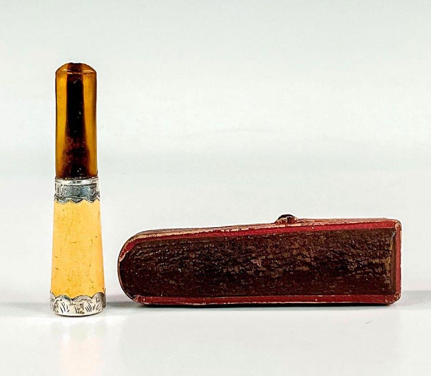 Sterling silver, bone and amber cigarette holder in original case, made by Arthur Wigley. Fabulous for the cigarette smoker who loved antiques. Hallmarked makers marks. Case measures: 3.5”L x 1”W x 1”H. Holder measures: 3”L x 0.75”W x 0.75”H.
