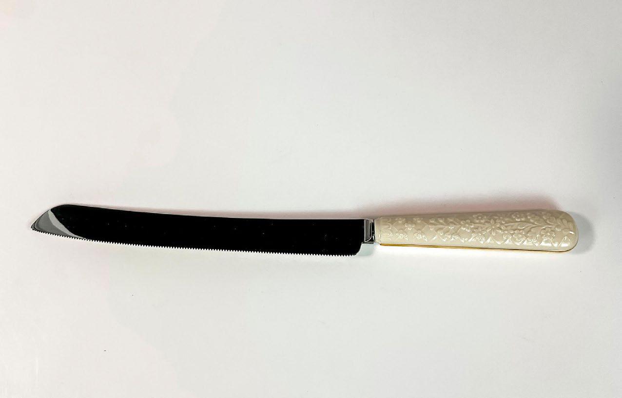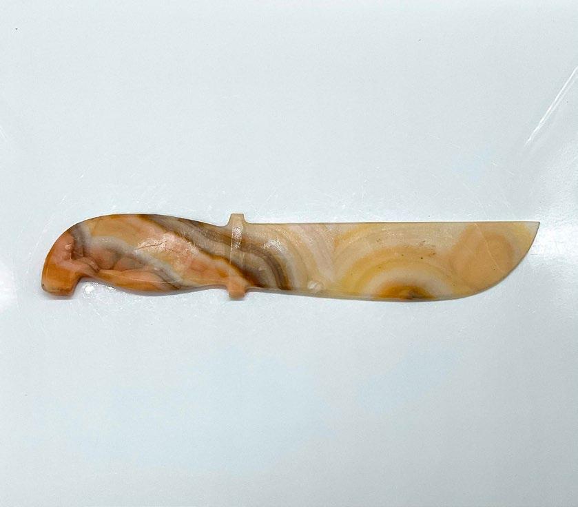 A Mexican onyx-color decorative knife. Sandy coloration with gray and orange curvy veins.