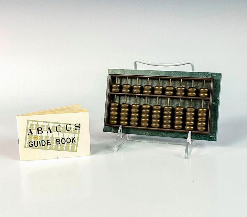Metal frame with nine rows of beads attached to green marbled stone base. Small booklet consists of 57 pages.