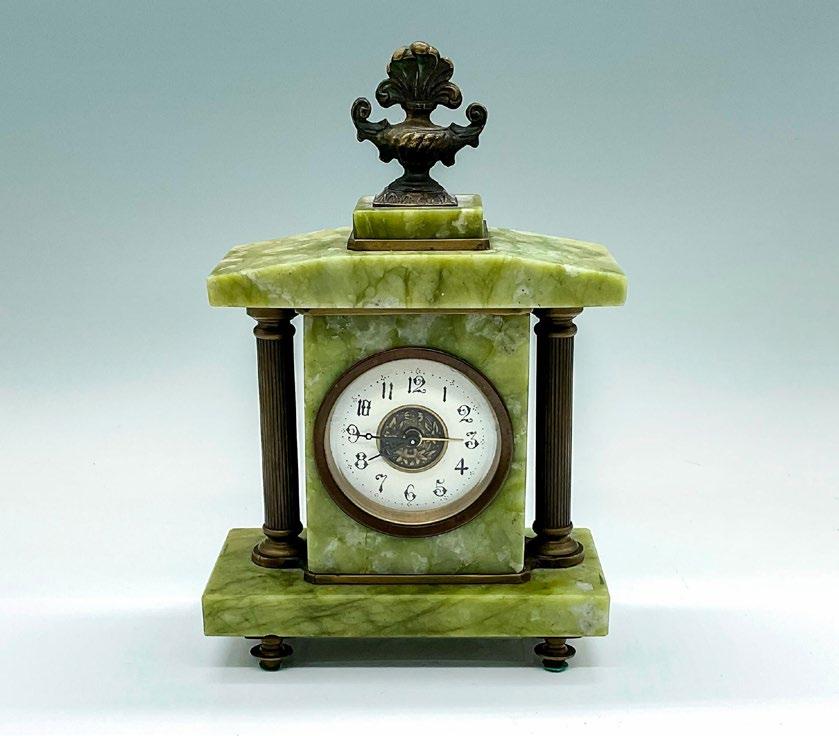 A beautiful small green footed clock with white speckles, and dark green veins. Adorn with brass columns on the sides and ornate fixture on the top.