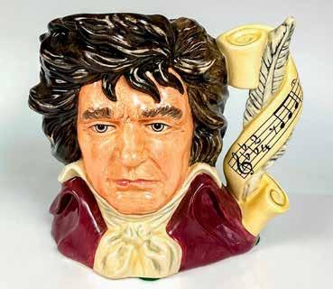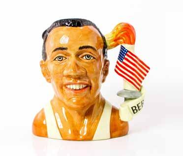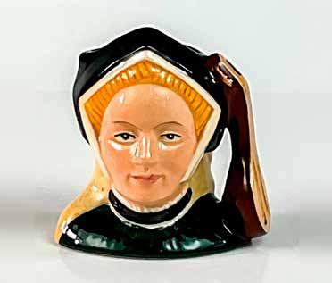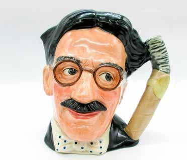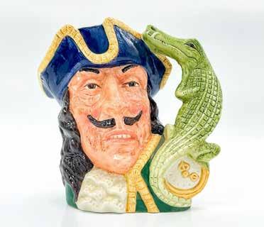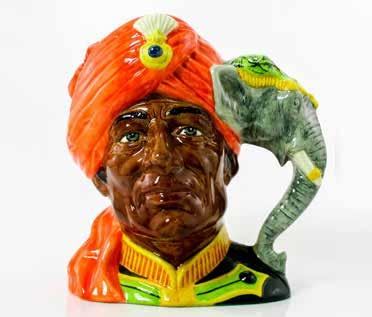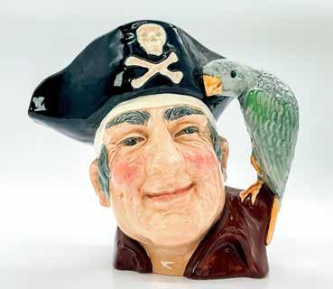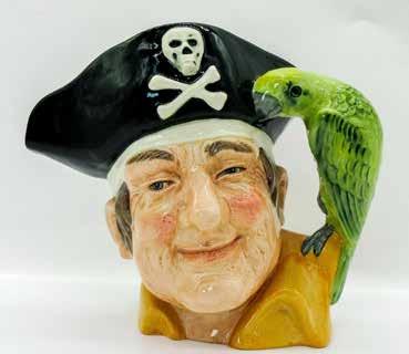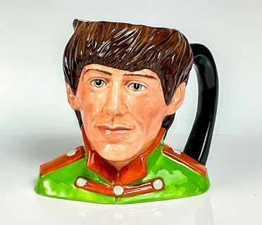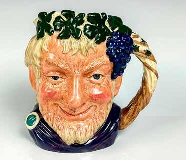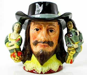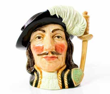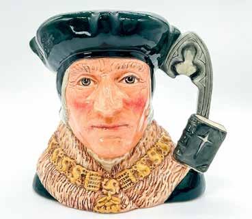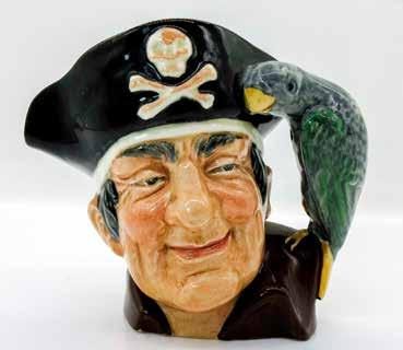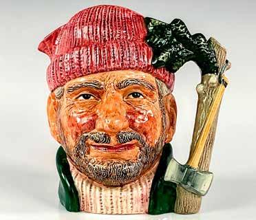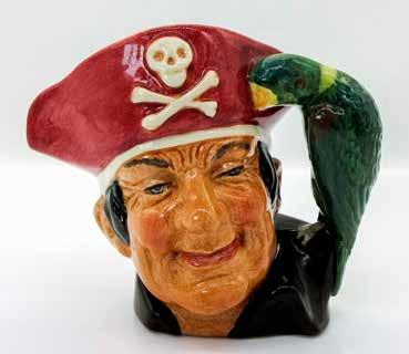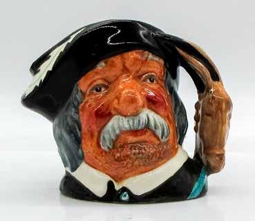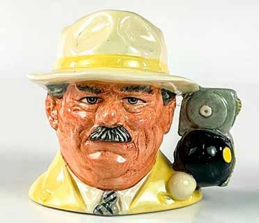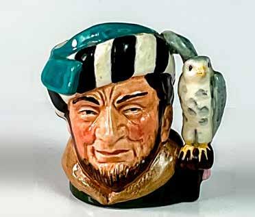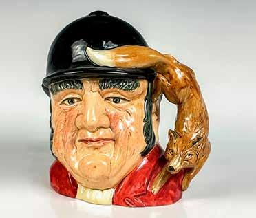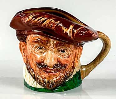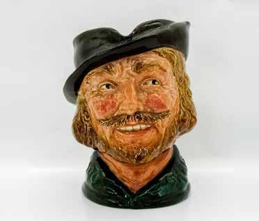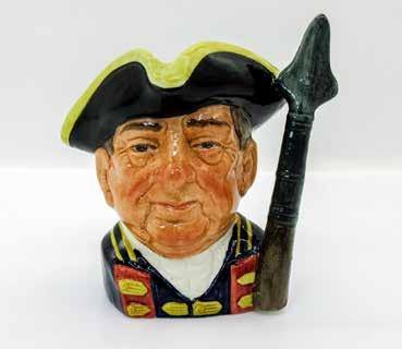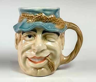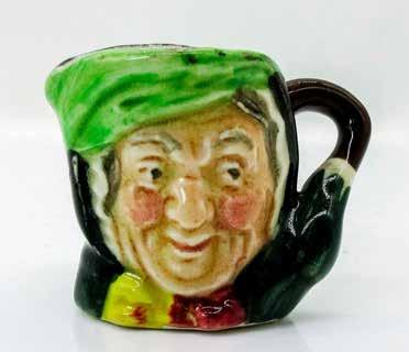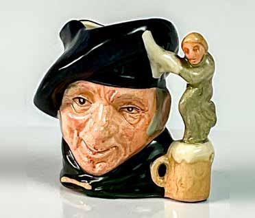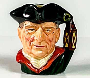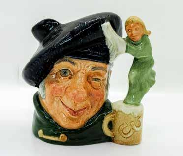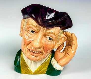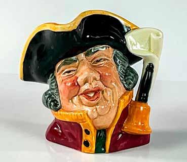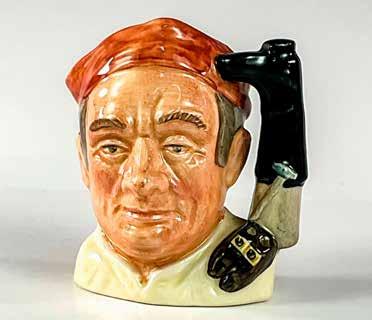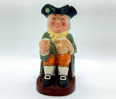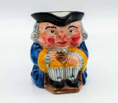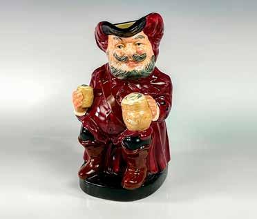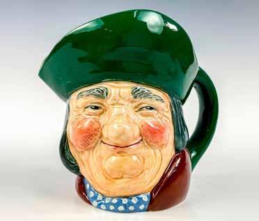 Green hat; brown coat; blue scarf with white spots. A “ thirsty old soul” in an 18th-century drinking song, Toby is thought by some to be the source of the traditional British Toby jug, in which a character sits astride a barrel of ale. Popular opinion suggests his name is a derivation of the French tope, to toast.Royal Doulton backstamp.
