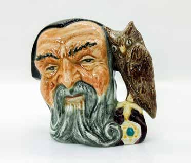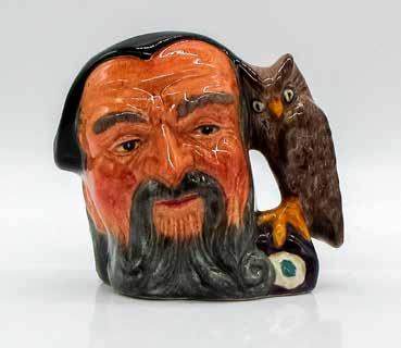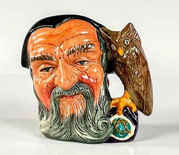 Part of the Mystical Character Series. Black, grey, blown, and purple coloration with owl handle. Royal Doulton backstamp.
