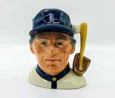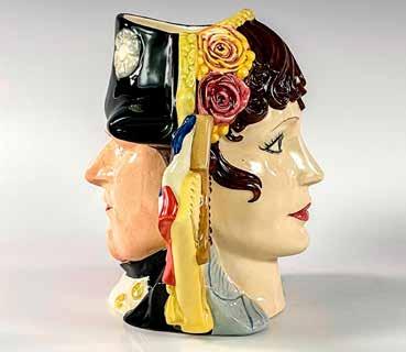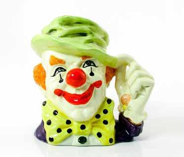 Brown hat; green coat; yellow scarf. Coming to England in the 17th century by way of Italy and France, the Punch and Judy puppet show features Punch, the hunchbacked boastful husband, who beats his shrew-like wife Judy. The colors on Punch’s bat are occasionally reversed with no effect on the market value. Royal Doulton backstamp.