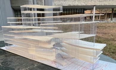 多層次的層板創造出交錯平面,尺度大 的高低差營造了許多虛實空間。結合案 例分析的學習,想利用【滲透】這種較 為柔和的安置手法介入既有地形,迎合 地形做變化,用量體串接的方式連貫整 座基地。