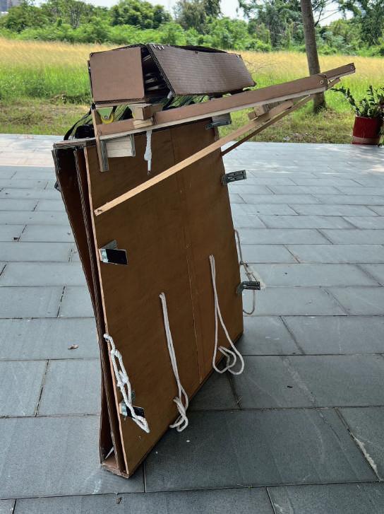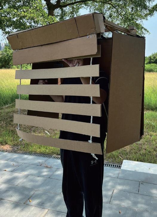 硬挺的木製背包能裝載許多裝置,也能 容納左右兩側的遮蔽,獨處時藉由繩子 的拉動展開,即可完成四周的閉合