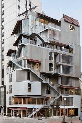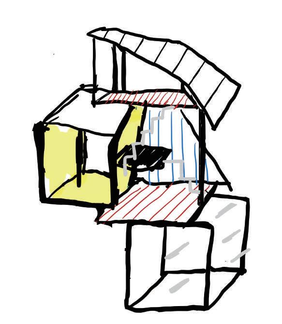 量體用某種對話關係纏繞,塊狀空間附 在原本的長方體中增生,伴隨而生的虛 空間也相應的滲透,交織型塑著建築。