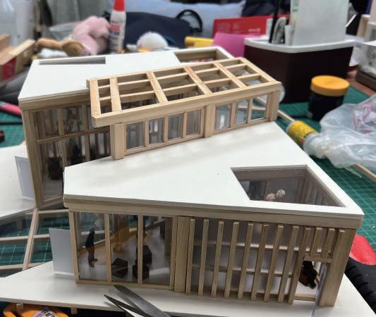 重新選取和組構的模型除了空間特質上的安排外,也開始注意到了尺 度的重要,從原本的單一板材與厚薄,漸漸加入了真實元素與不同厚 度的牆板、梁柱等,學習不同材料之間的運用,和更多真實細節上的 呈現