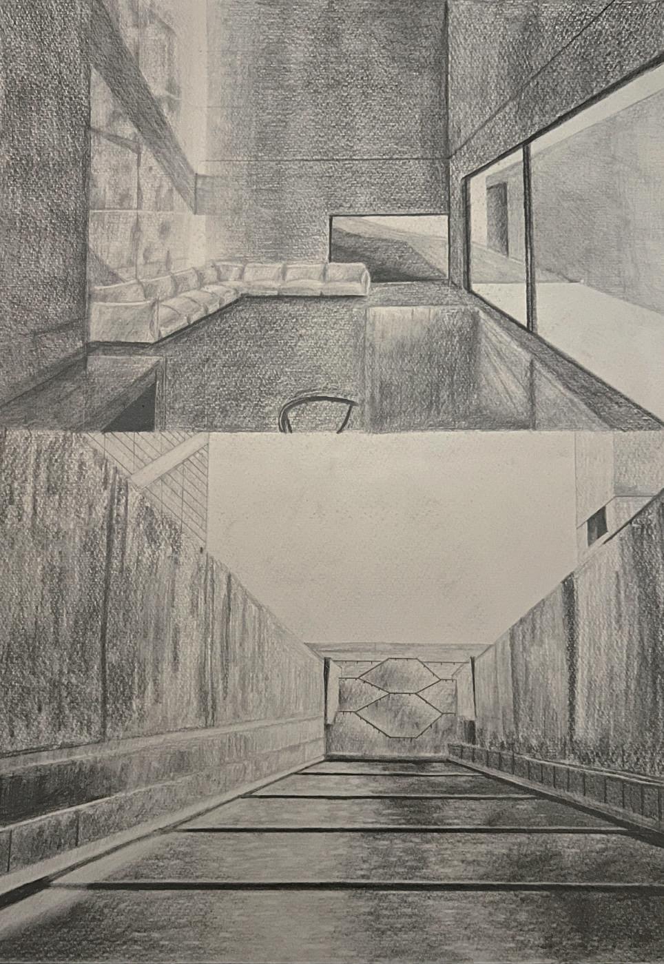 他是一個完整度較高的空間量體,保有跟地 形一定程度上的配合,能看出如何跟高地落 差的基地作對話,選這裡做實體詮釋也能更 好的發展出建築跟地形的趣味性。