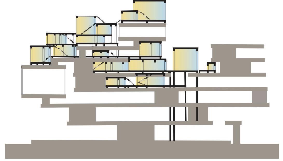 以不同量體的堆疊為主概念,確立上與 下之後開始往四周發展,彼此創造出不 同特質的空間關係,營造壓迫、通透、 開放與半開放等的空間體驗
