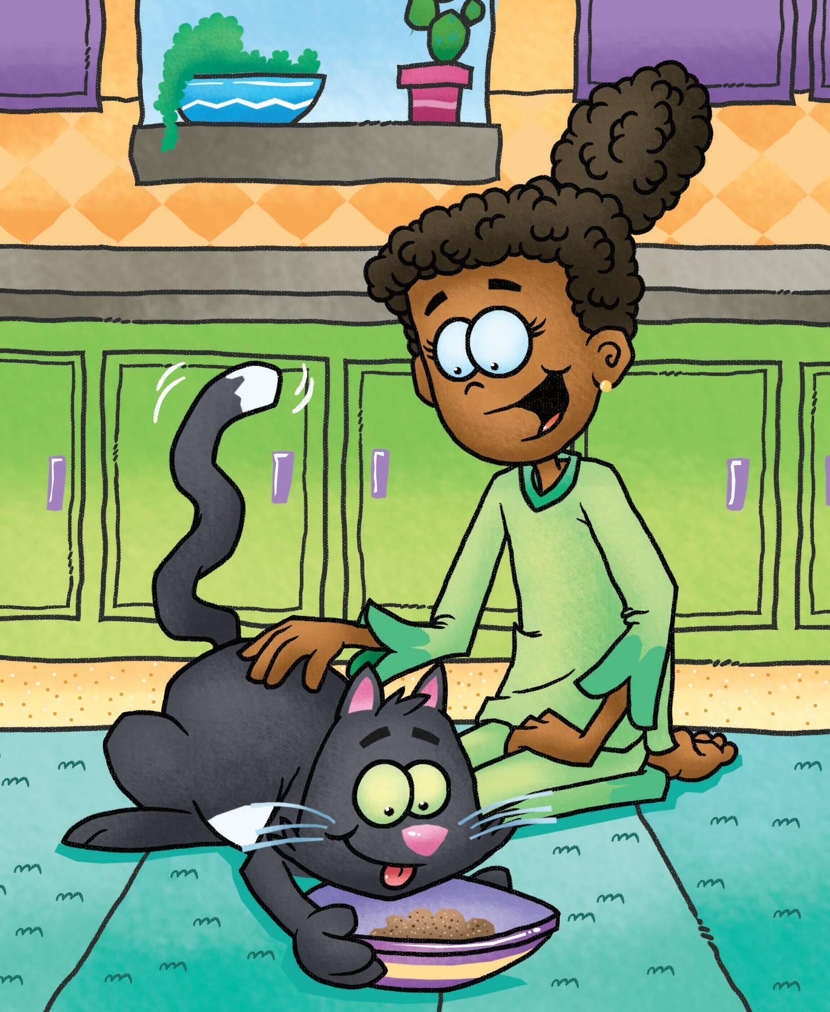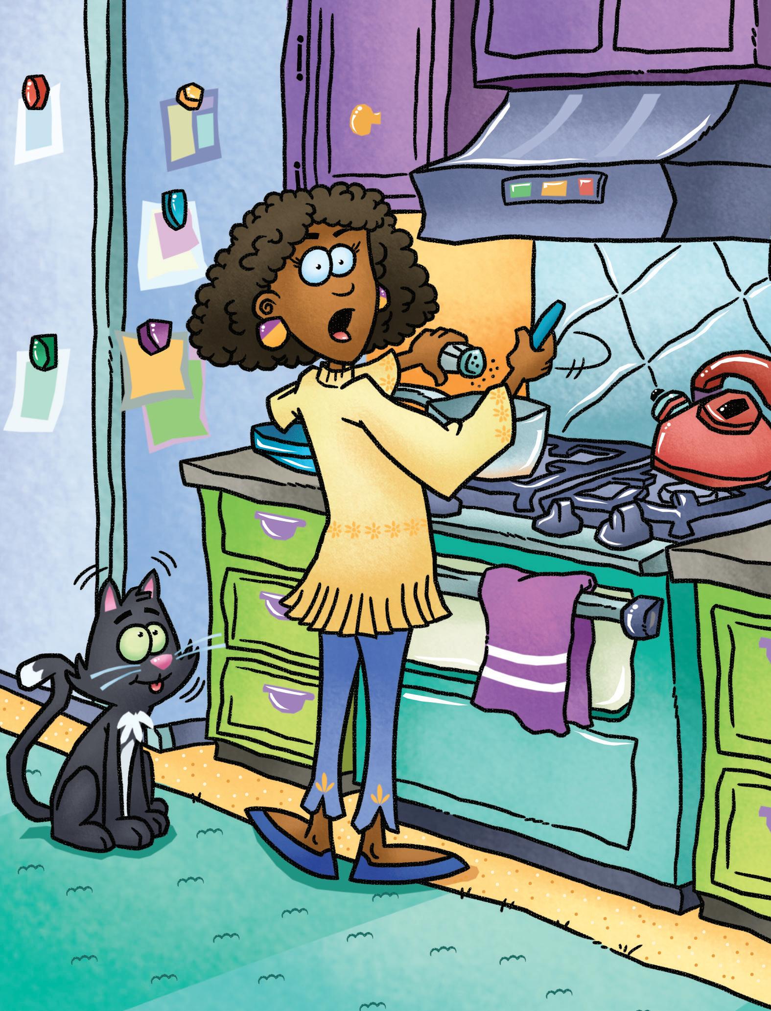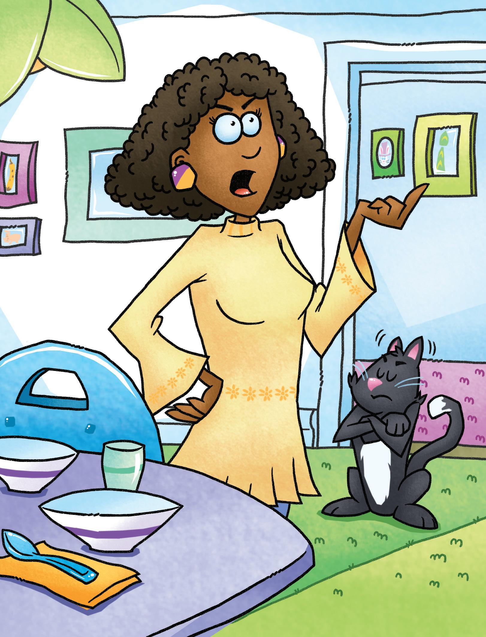 Dad yells, “Meg, you have to fix the cat’s mess. Get up! Jet’s mess is on the rug.”
