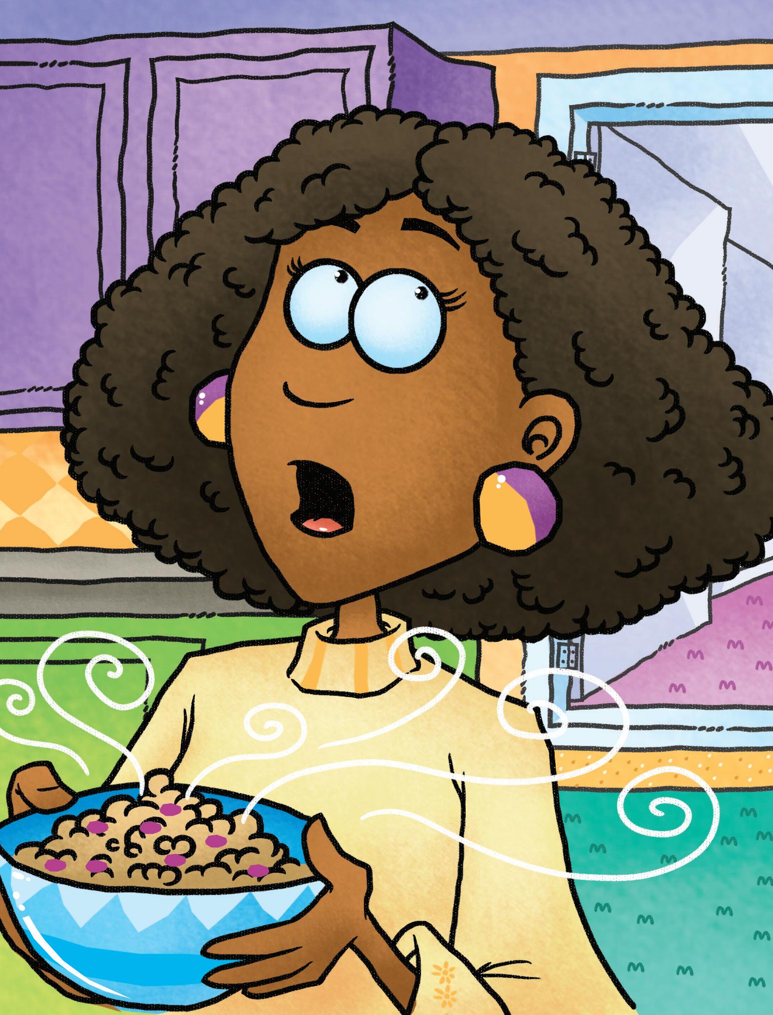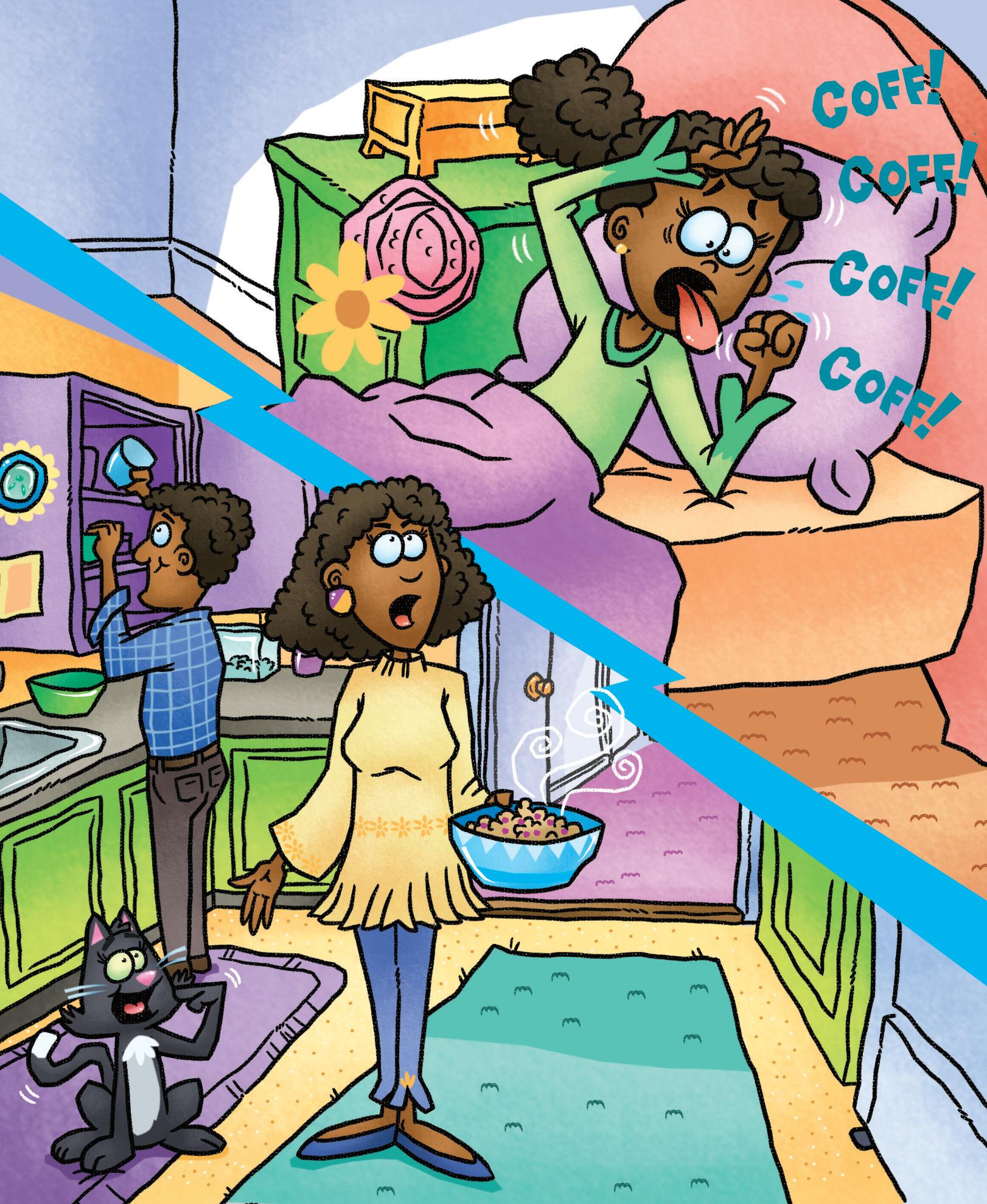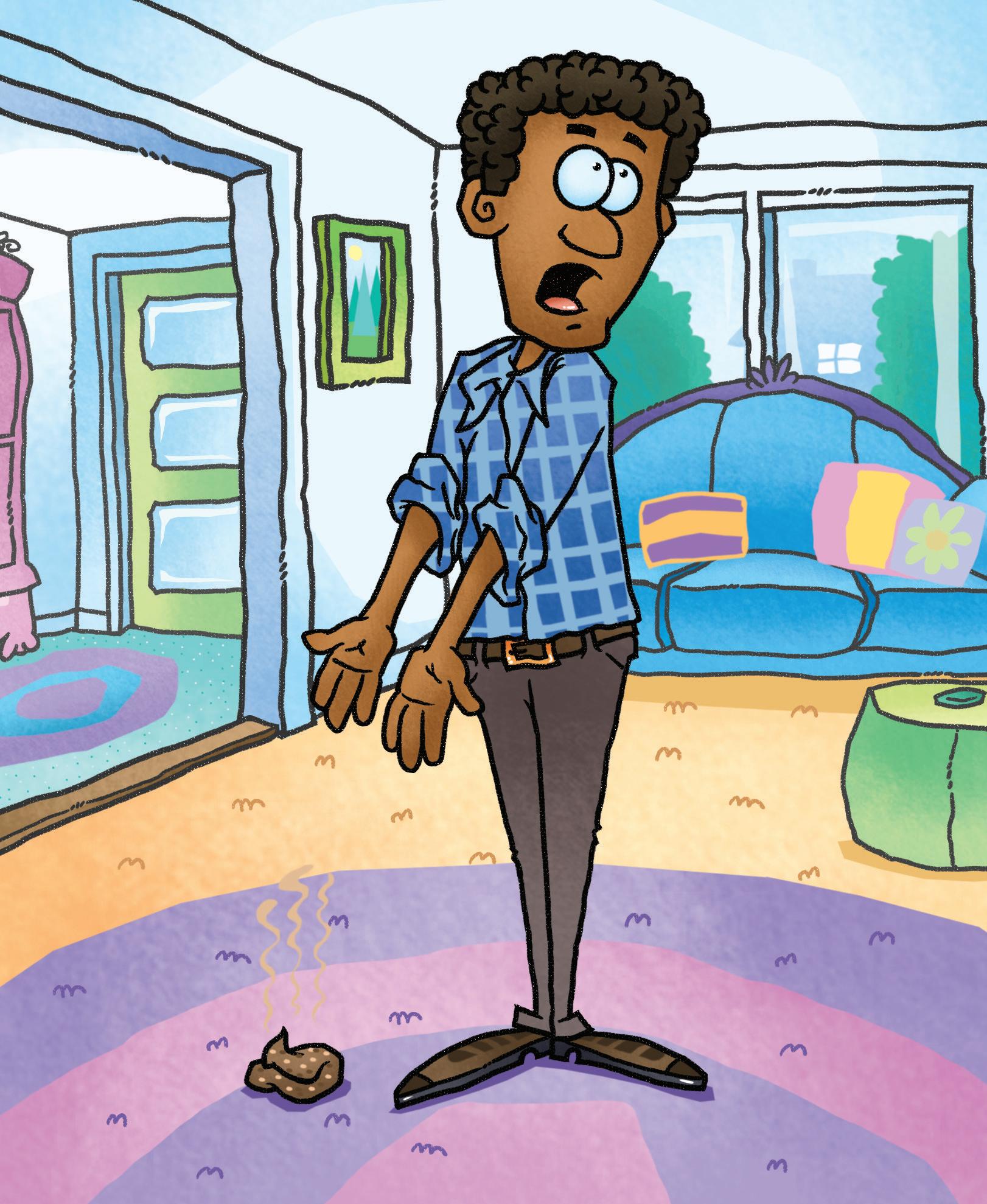 Dad yells, “Meg, you have to fix the cat’s mess. Get up! Jet’s mess is on the rug.”