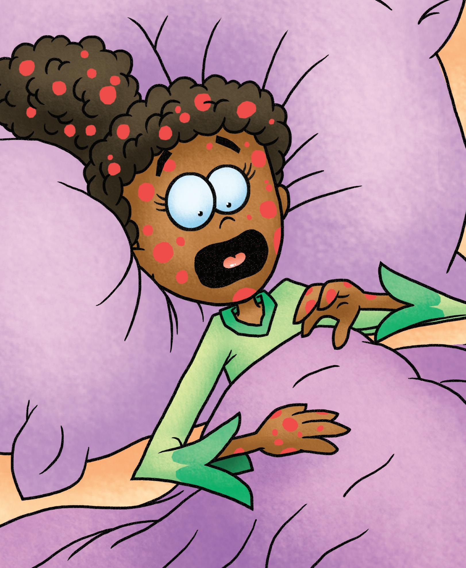 Meg yells, “But, Mom, I am hot and have big, red dots. I can not get up.”