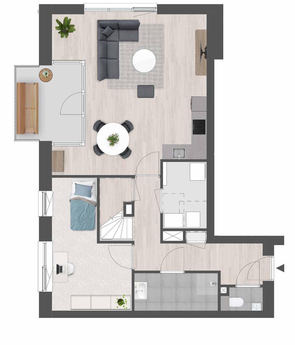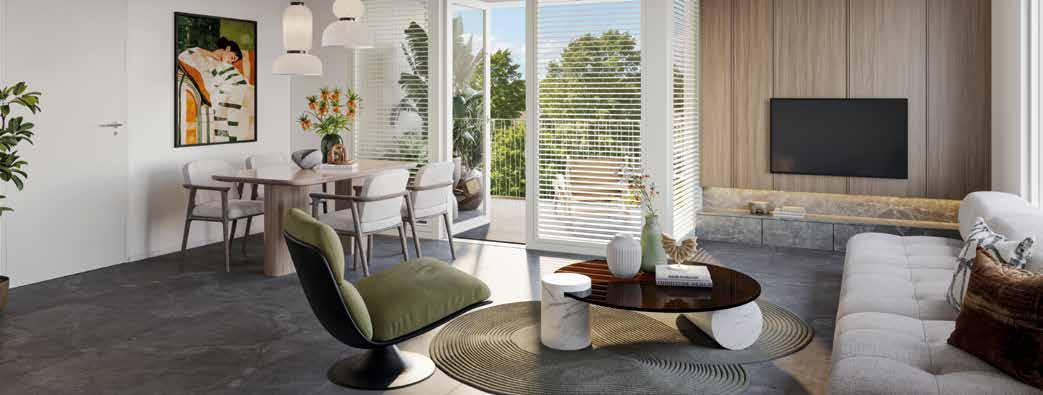The apartments are designed with an eye for space and light. Large floor-to-ceiling windows allow daylight to flow in generously and enhance the open character of the homes. The ground-floor apartments