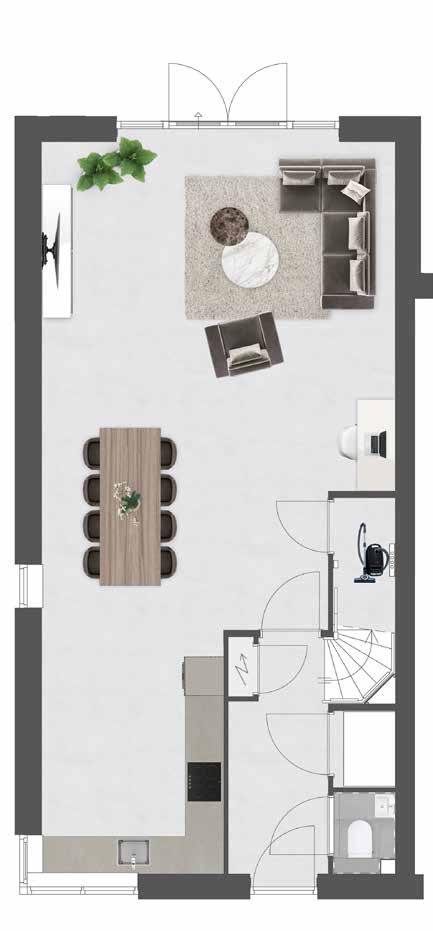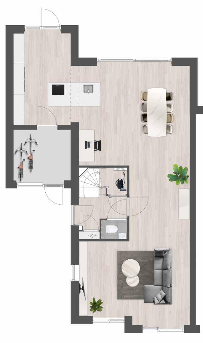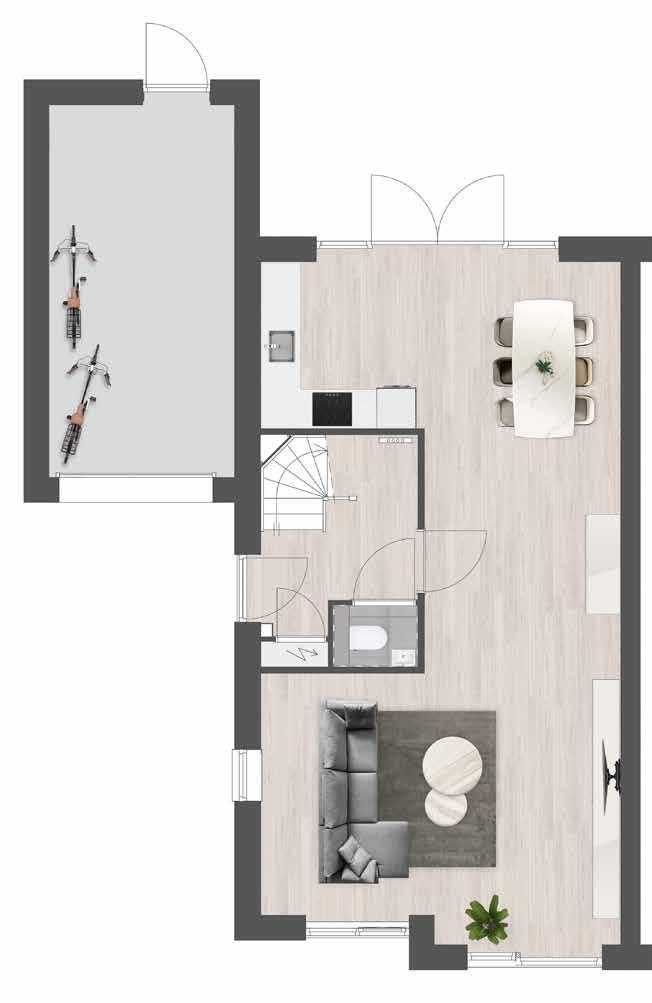 4 Gedeelte garage aan woonruimte toevoegen met ruimte voor een grote leefkeuken met kookeiland. Voormalige garage uitvoeren als berging met loopdeur