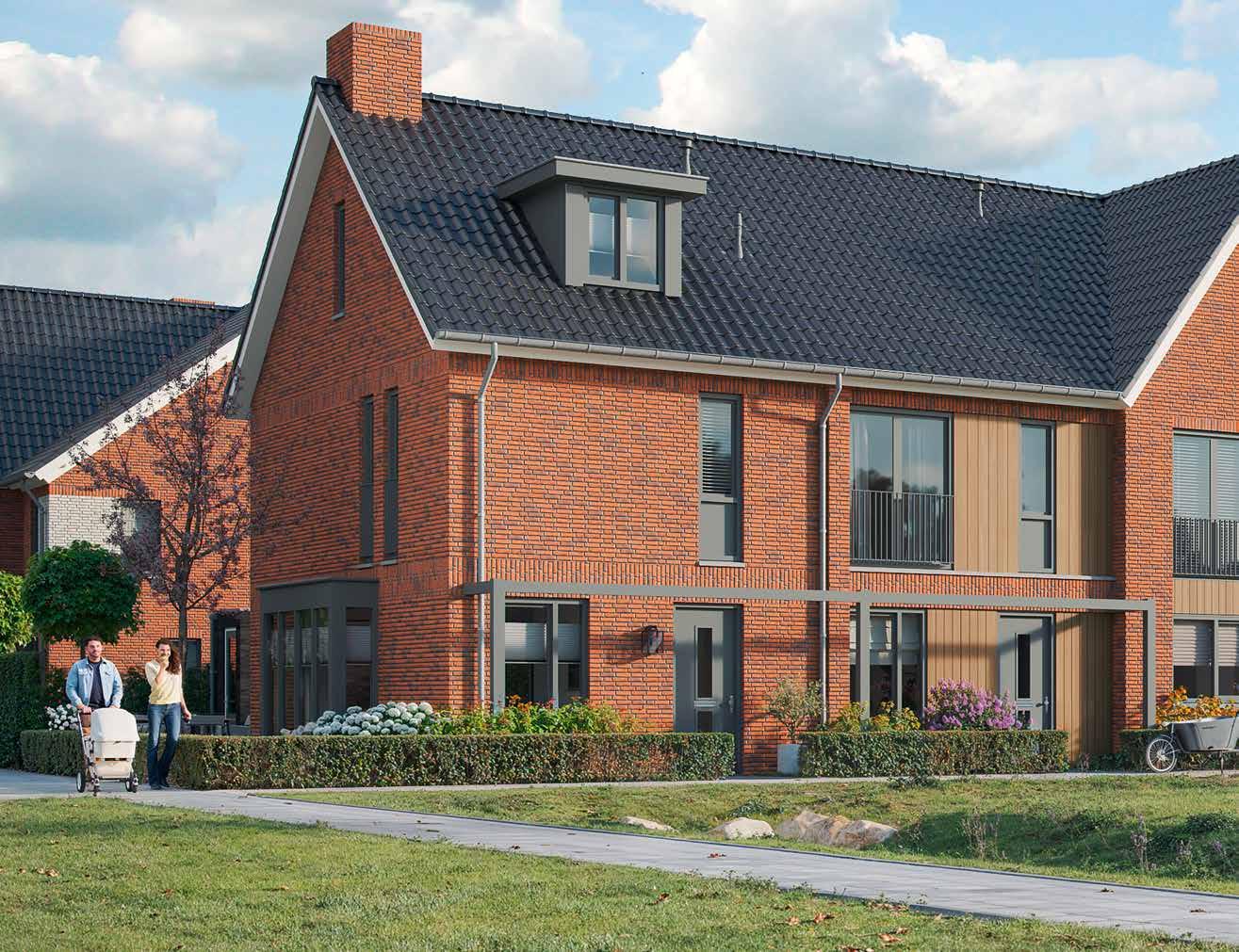 De woningen aan de linker zijde (westkant) maken onderdeel uit van het cluster met de achterliggende appartementen. Deze worden uitgevoerd in twee kleuren metselwerk en worden voorzien van houtlook accenten die het natuurlijke karkater van de wijk versterken.