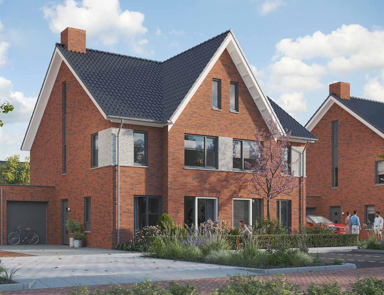 De twee-onder-één kap woningen hebben door de statige topgevel een rijzig karakter. Hier worden witte accenten gemaakt die het geheel een fris karakter geven. De donkere kleur van de kozijnen en het bloemkozijn op de begane grond zorgen ervoor dat de traditioneel opgezette woning toch een eigentijdse twist heeft.