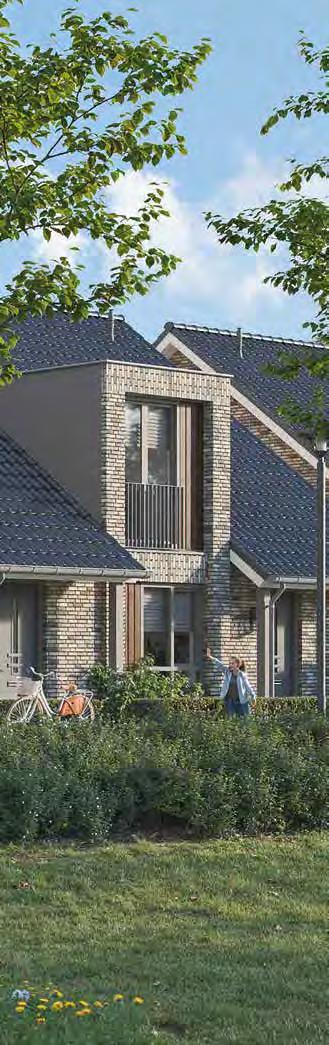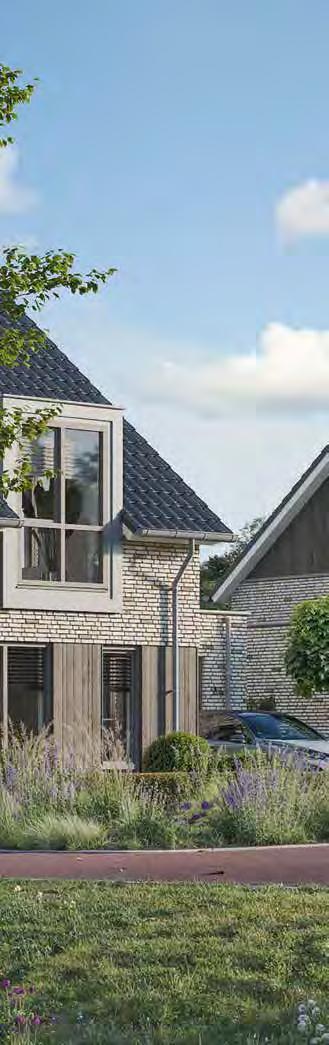 Naast traditionele materialen als baksteen, houten kozijnen en een pannendak hebben we als accentmateriaal in de plint houtlook delen toegepast, die de natuurlijke sfeer van de wijk versterken.