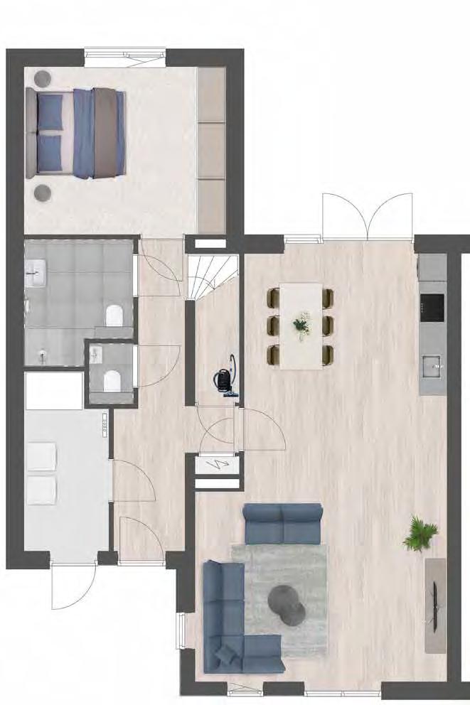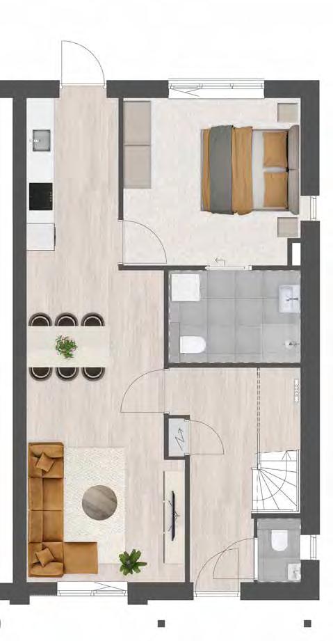 • Volledig woonprogramma met keuken, woonkamer, slaapkamer en badkamer op begane grond