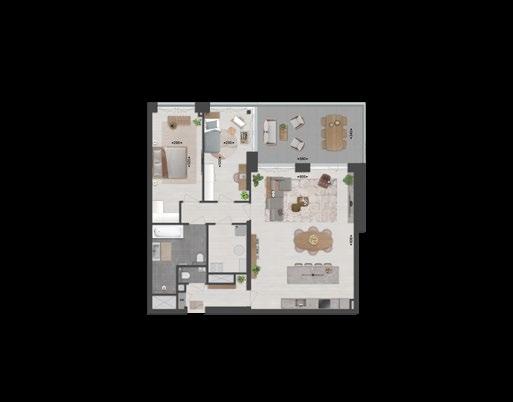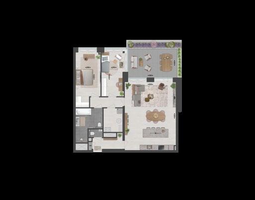 Een sfeervol appartement op de begane grond. Het gespiegelde appartement van bouwnummer 2 Je voelt je helemaal thuis in dit gezellig appartement. De woonkamer is direct gelegen aan het terras van circa 20 vierkante meter groot. Daardoor loop je zo naar buiten. Daarnaast heb je een royale keuken met kookeiland. Met de grote ramen en schuifdeur naar het terras gaan buiten en binnen naadloos in elkaar over. Je slaapt hier aan de voorzijde, zodat je ook in de avond mooi zicht op de monumentale bomen blijft houden. Geniet jij binnenkort in het ruime appartement van de rust op het landgoed en het buitenleven.