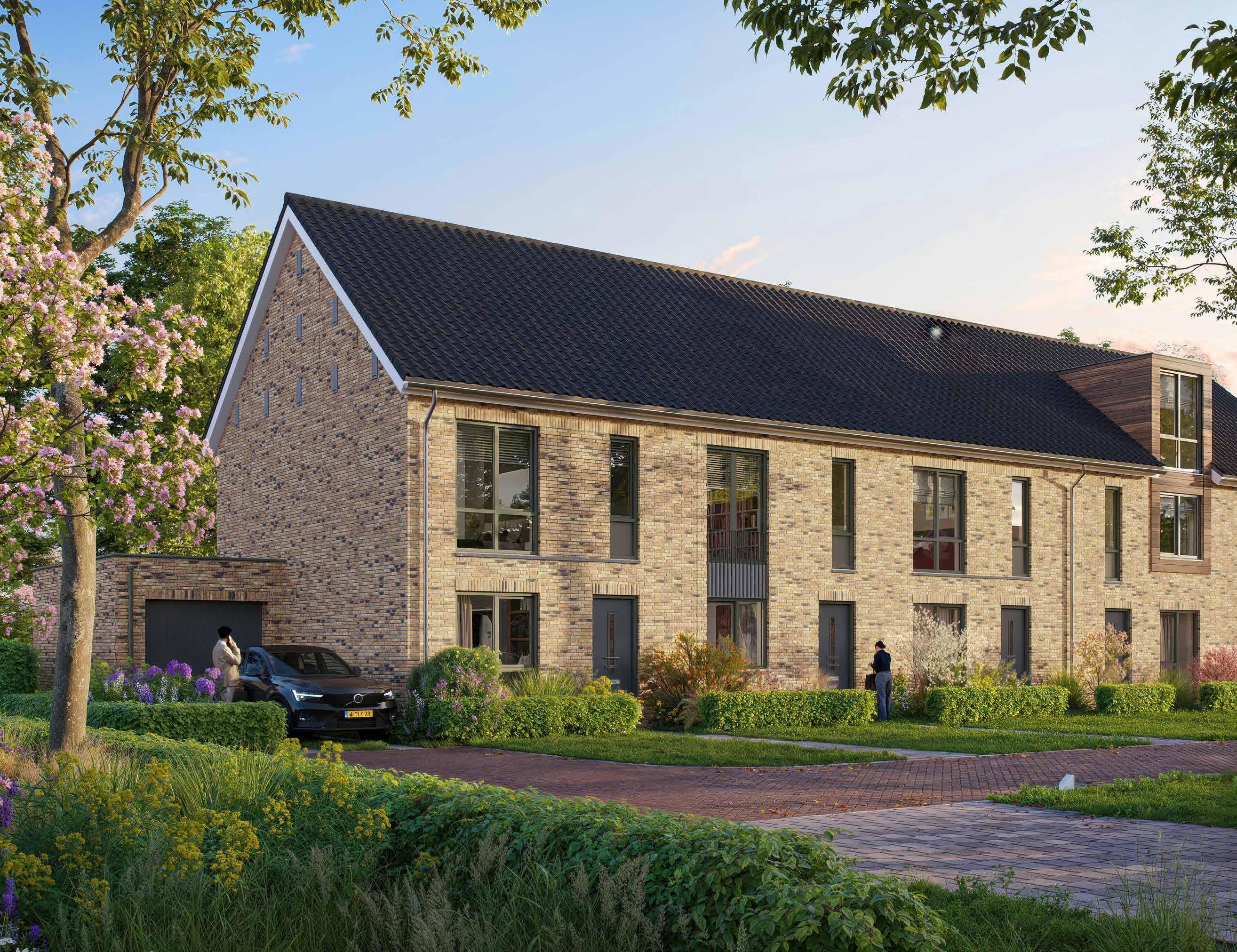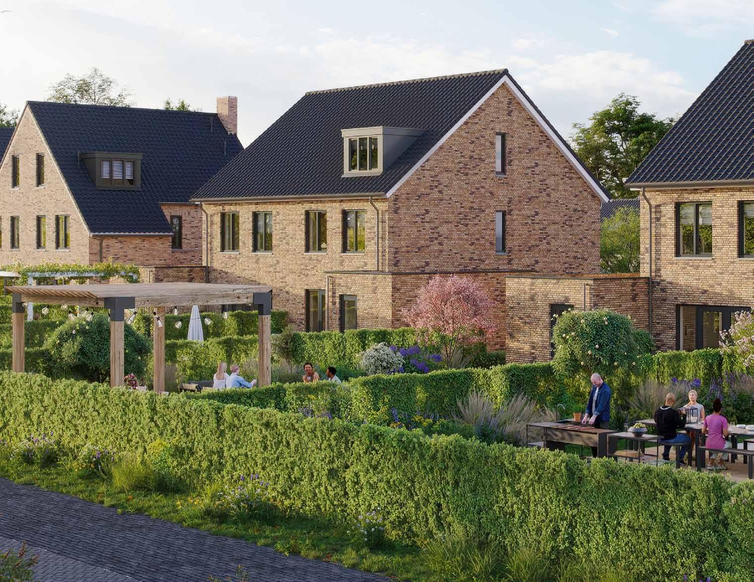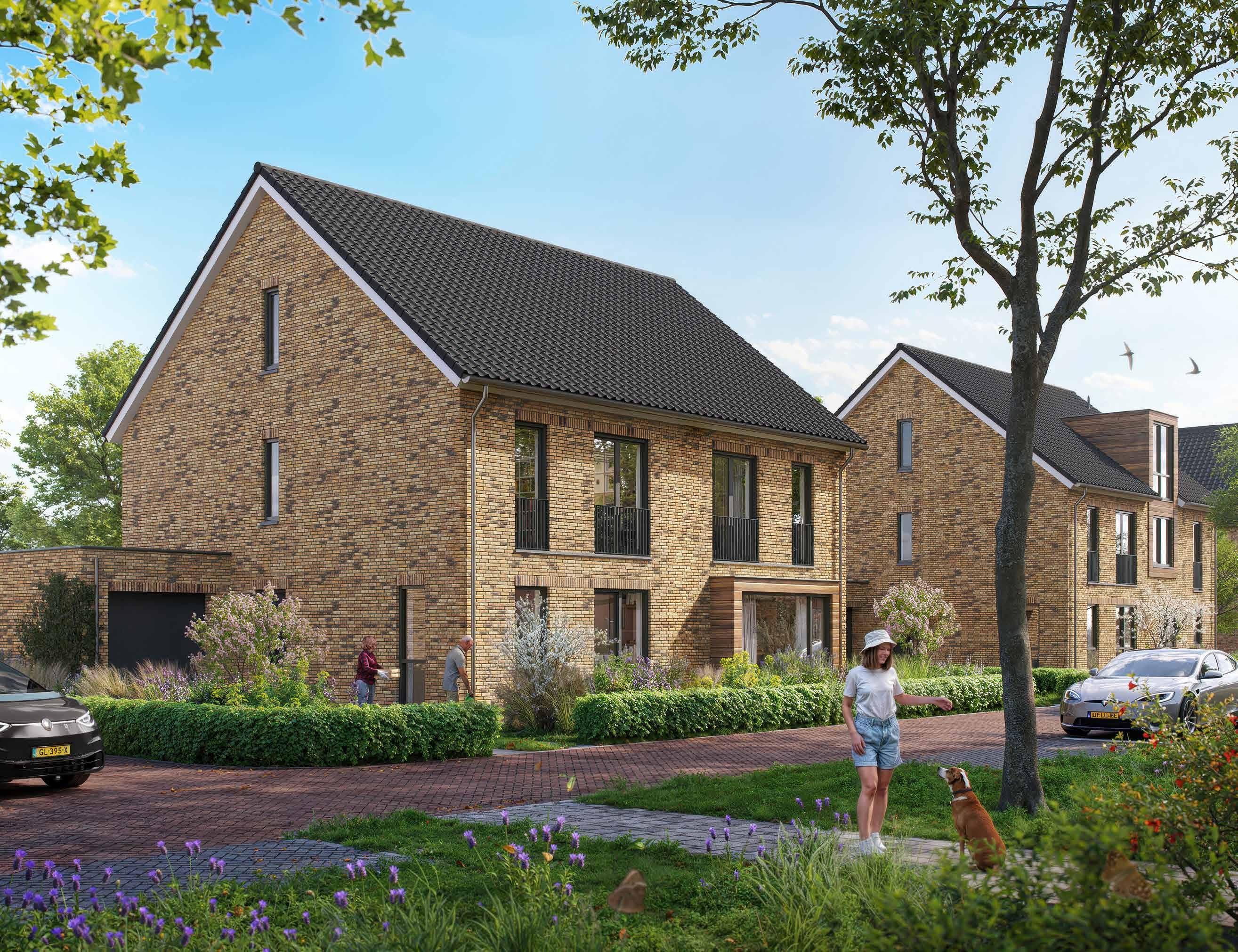 De architectuur ademt rust en samenhang. Alle woonblokken worden uitgevoerd in metselwerk met lichte, aardse tinten en hebben een antracietkleurig pannendak met overstek. Subtiele variaties in metselwerk, pergola’s, erkers en dakkapellen zorgen voor afwisseling en een dorps karakter.
