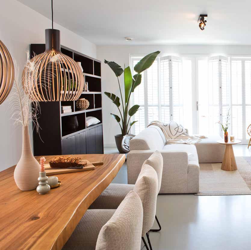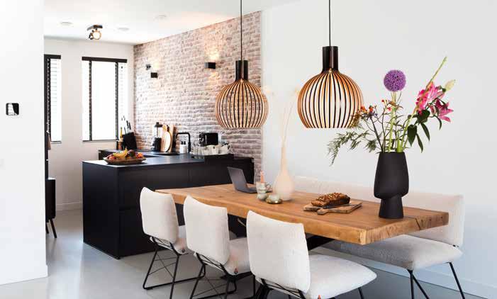 aansluit op de tuin. De eethoek - robuust houten blad en beige stoelen met zwart onderstel - vormt de natuurlijke verbinding tussen keuken- en zitgedeelte. De Secto designlamp is hier een ware eyecatcher.