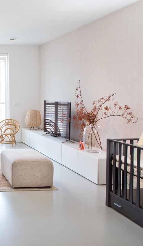 In de zithoek zorgt het donkere wandmeubel eveneens voor contrast, terwijl verder vooral lichte en nat rken of buitensluiten. De hele begane grond heeft een mooie strakke beige gietvloer; op de wanden is stucwerk en renovlies behang in rustige tinten aangebracht.