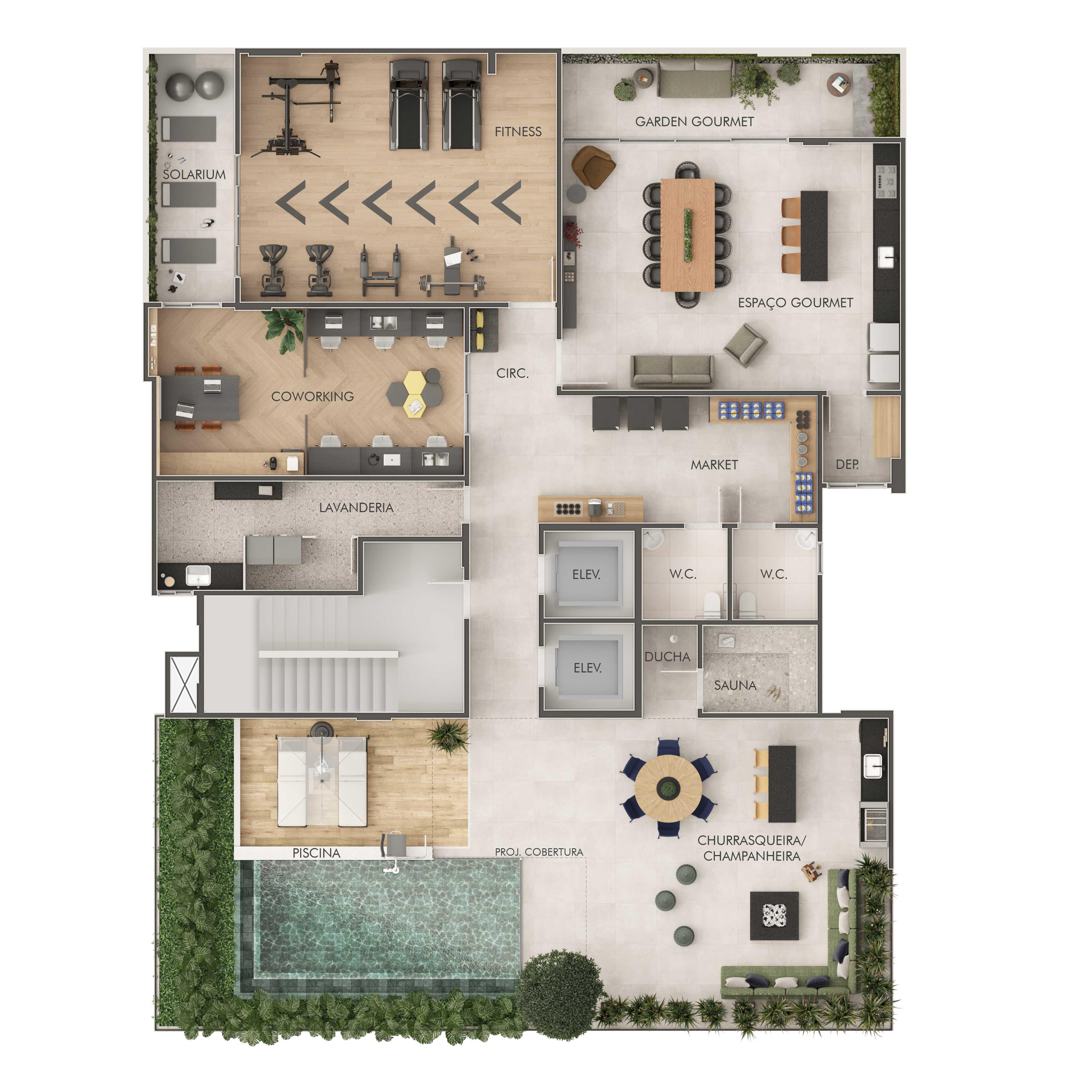 Com uma área de 344,91m², você poderá desfrutar do melhor que a vida tem a oferecer. O espaço conta com um solarium integrado ao fitness completo para cuidar da saúde, espaço gourmet com garden, além de uma área com piscina de borda infinita, integrada com sauna, churrasqueira e champanheira, perfeitos para momento de relaxamento e conveniência com market, lavanderia e coworking trazendo praticidade para seu dia a dia.