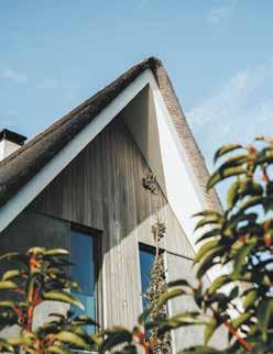 ‘We vangen regenwater op. Je ziet in de tuin een luik, hieronder zit een waterreservoir waar we 10.000 liter water kunnen opvangen en opslaan. Dat gebruiken we bijvoorbeeld voor het spoelen van de toiletten en het lappen van de ramen. Het droogt mooi, streep loos op.’ lacht Pieter. ‘Wat ik verder duurzaam vind, is om materialen waar je mee werkt zoveel mogelijk uit de buurt te halen. Zo komen het riet voor het dak van een rietveld in Noord-Holland en kalkzandsteen uit Harderwijk (geen gasgestookte indus trie). Daarnaast hebben we voor de betonconstructie een
