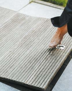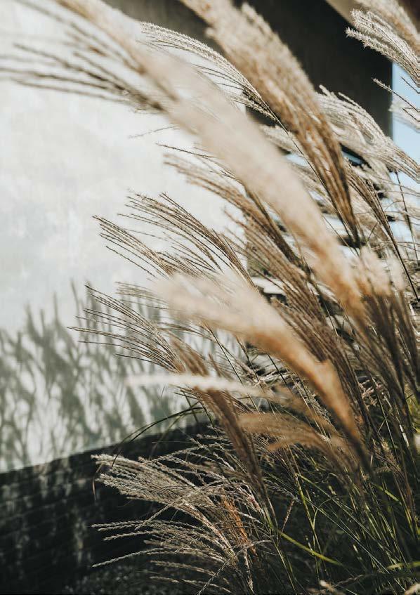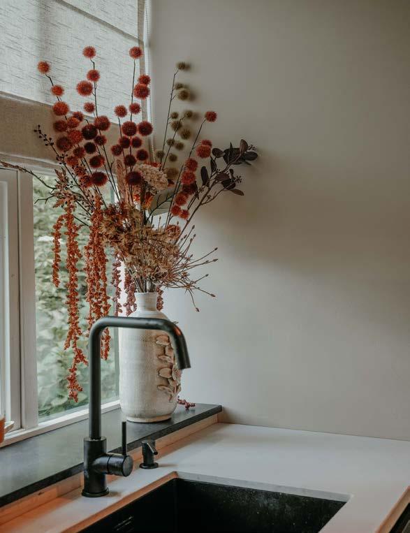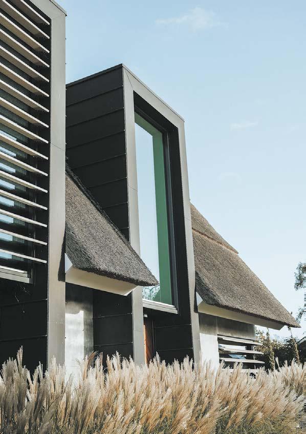 ‘We vangen regenwater op. Je ziet in de tuin een luik, hieronder zit een waterreservoir waar we 10.000 liter water kunnen opvangen en opslaan. Dat gebruiken we bijvoorbeeld voor het spoelen van de toiletten en het lappen van de ramen. Het droogt mooi, streep loos op.’ lacht Pieter. ‘Wat ik verder duurzaam vind, is om materialen waar je mee werkt zoveel mogelijk uit de buurt te halen. Zo komen het riet voor het dak van een rietveld in Noord-Holland en kalkzandsteen uit Harderwijk (geen gasgestookte indus trie). Daarnaast hebben we voor de betonconstructie een