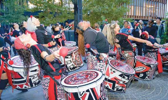 all-female Afro-Brazilian percussion band, Batala DC, lean back during their performance at the celebra tion of